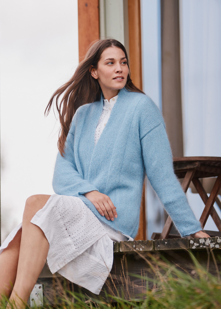 Lana Grossa-Qualität „Ecopuno“ (72 % Baumwolle, 17 % Schurwolle (Merino), 11 % Alpaka (Baby), LL = ca 215 m/50 g): ca 300 (350 - 400 - 450) g Himmelblau (Fb 69), Lana Grossa-Qualität „Silkhair“ (70 % Mohair (Superkid), 30 % Seide, LL = ca 210 m/25 g): ca 150 (175 - 200 - 225) g Zartblau (Fb 201); Stricknadeln Nr 4,5; 1 lange Rundstricknadel Nr 4,5; 1 Häkelnadel Nr 4.