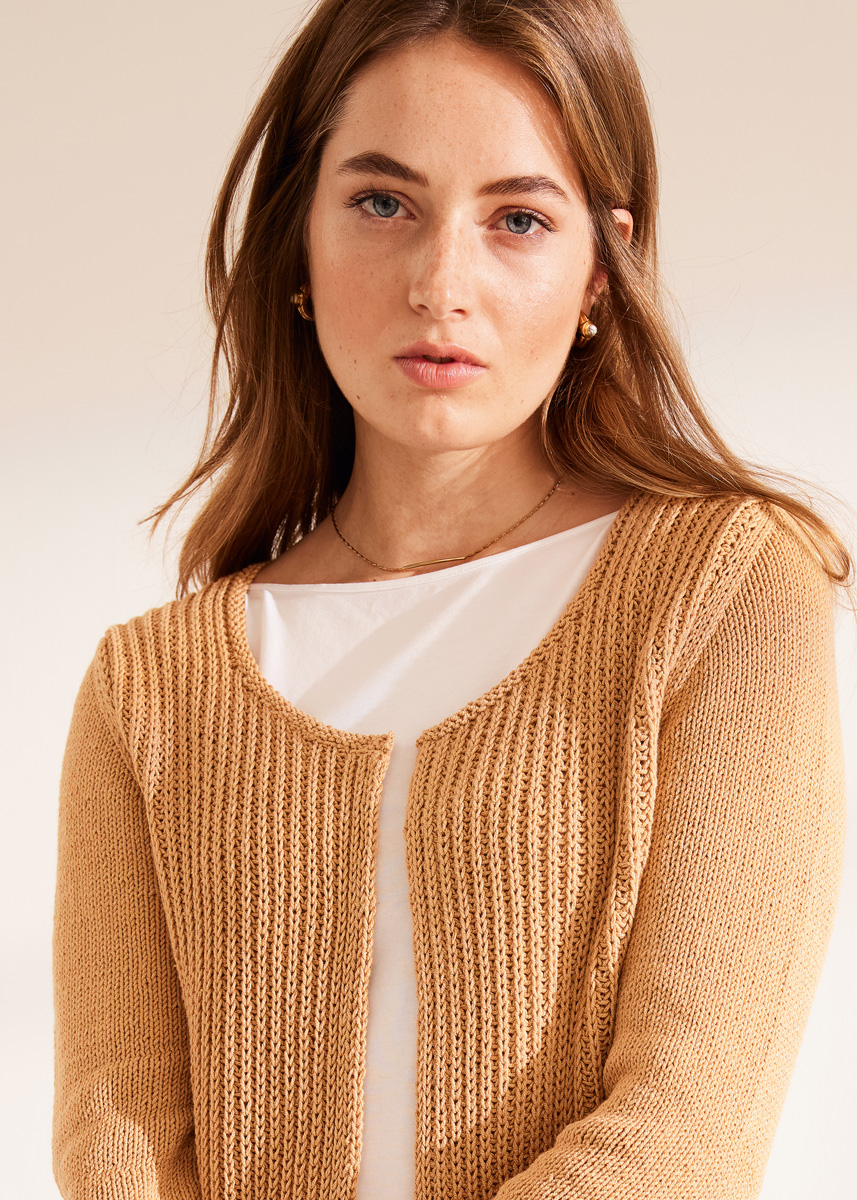 Lana Grossa Elastico (96% Baumwolle, 4% Polyester (Elité), Lauflänge 160 m/50 g), 500 (550 – 600) g Camel (Fb. 177); Stricknadeln Nr. 4 und 4,5, 1 Rundstricknadel Nr. 4, 40 cm lang.