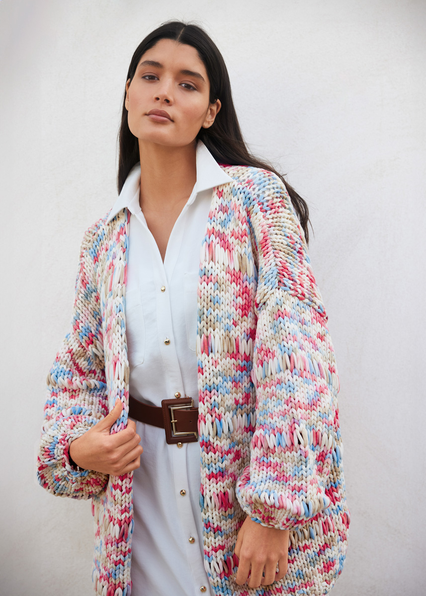 Lana Grossa Gelato (52% Baumwolle, 48% rec. Polyamid, Lauflänge 80 m/100 g), 900 (1000 – 1100) g Creme/ Hell-/Graubeige/Graublau/Fliederlila/Rosa/Pink/Lachsrot (Fb. 10); Stricknadeln Nr. 12 und 15.