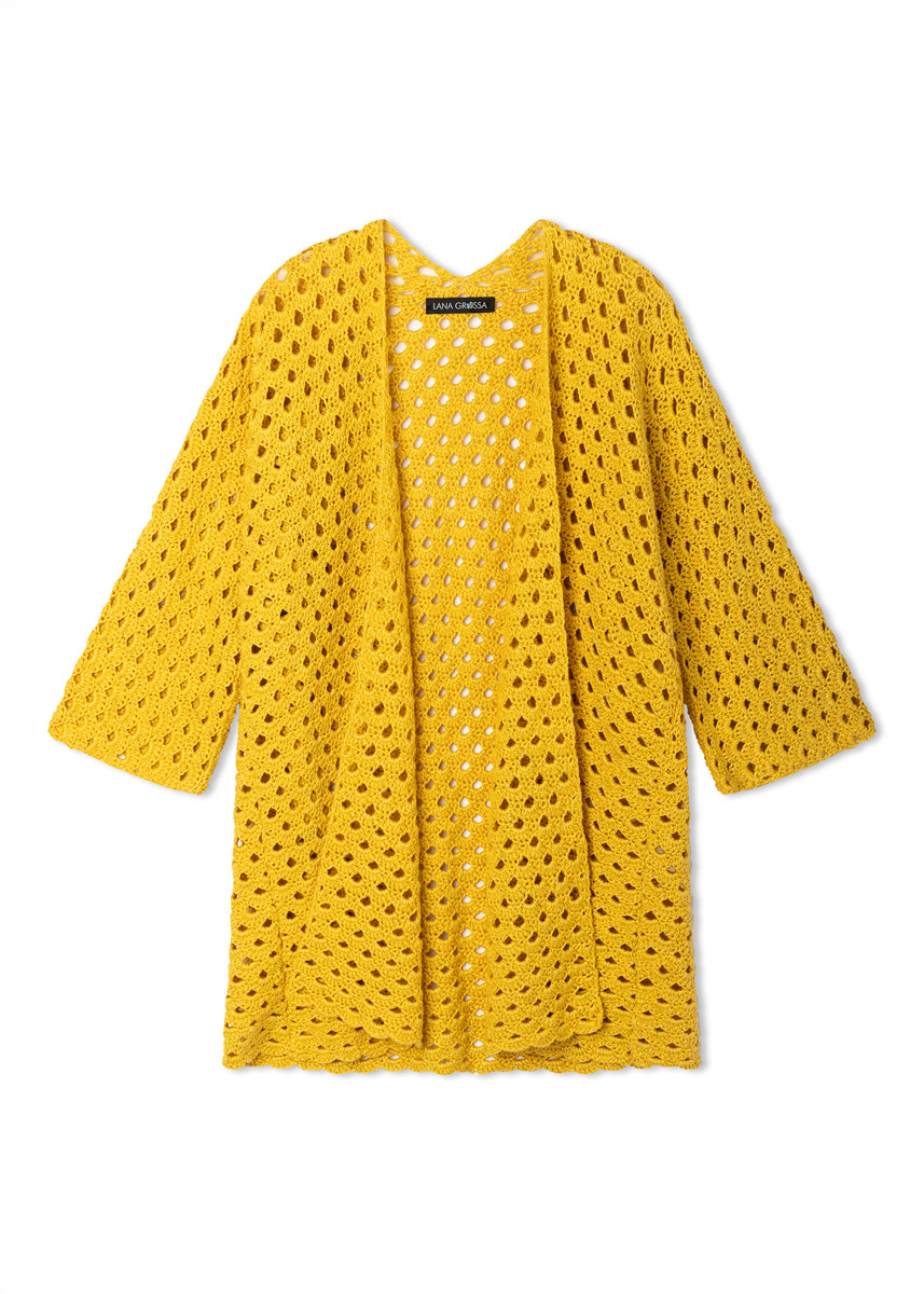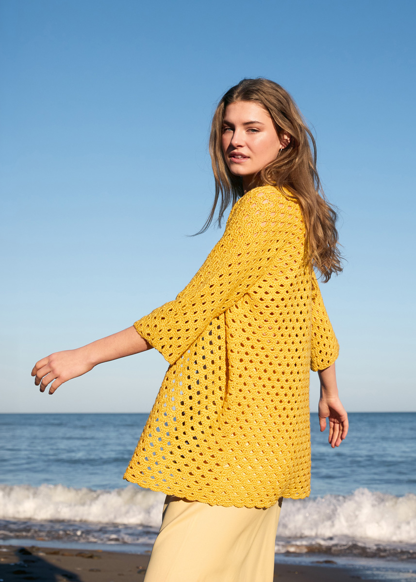 Strahlendes Dottergelb und luftige Bögen: Mehr Sommer geht nicht. Top-down-Technik und T-Form machen den Cardigan zeitlos schlicht – LINARTE.