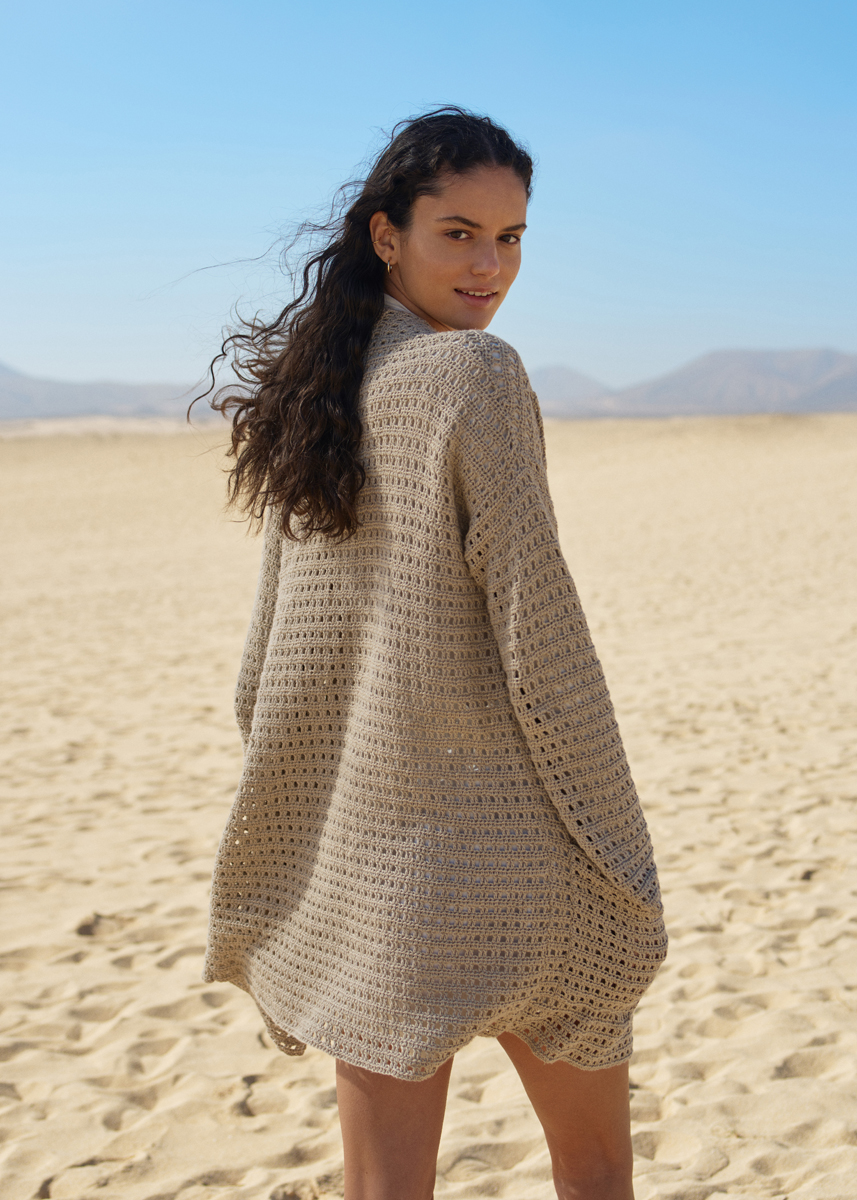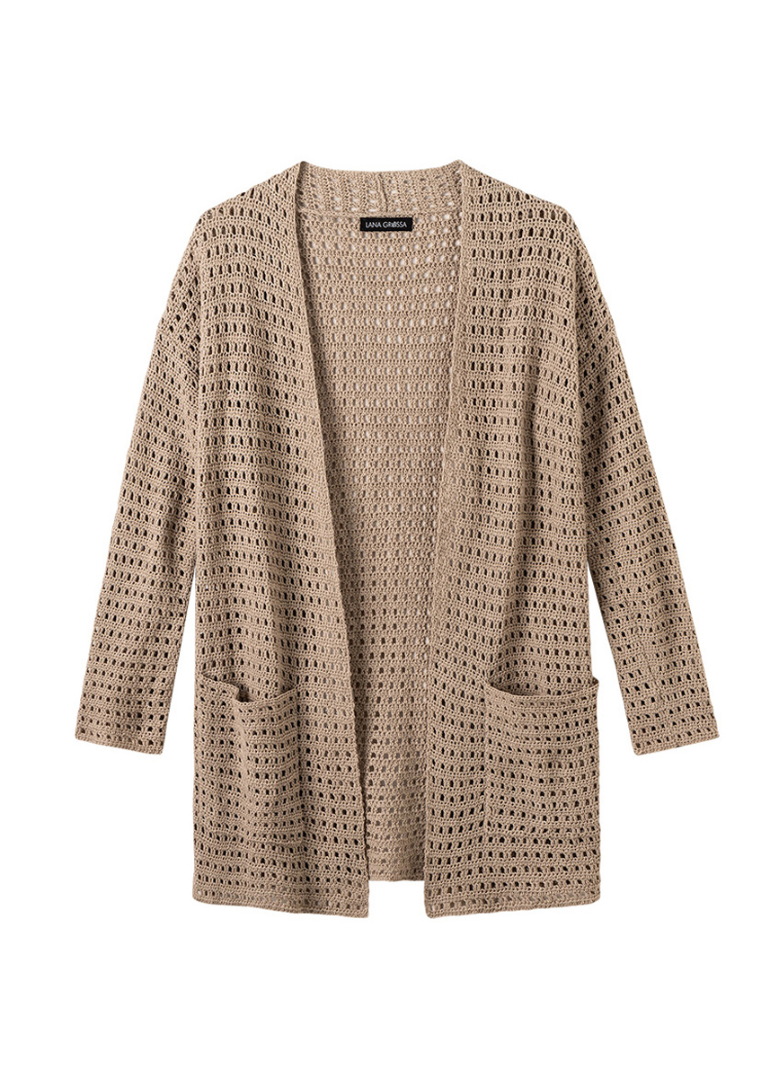 Lana Grossa-Qualität „Linissimo” (50 % Leinen, 50 % Baumwolle, LL = ca. 187 m/50 g): ca. 500 (550 – 600 – 650) g Graubeige (Fb. 2); 1 Wollhäkelnadel Nr. 3.
