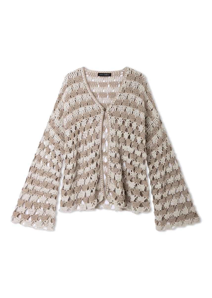 Dieser Cardigan entspricht in Muster und Machart dem Top von Seite 29/Modell 22. Highlight hier: die überlangen Trompetenärmel – GIOIA.