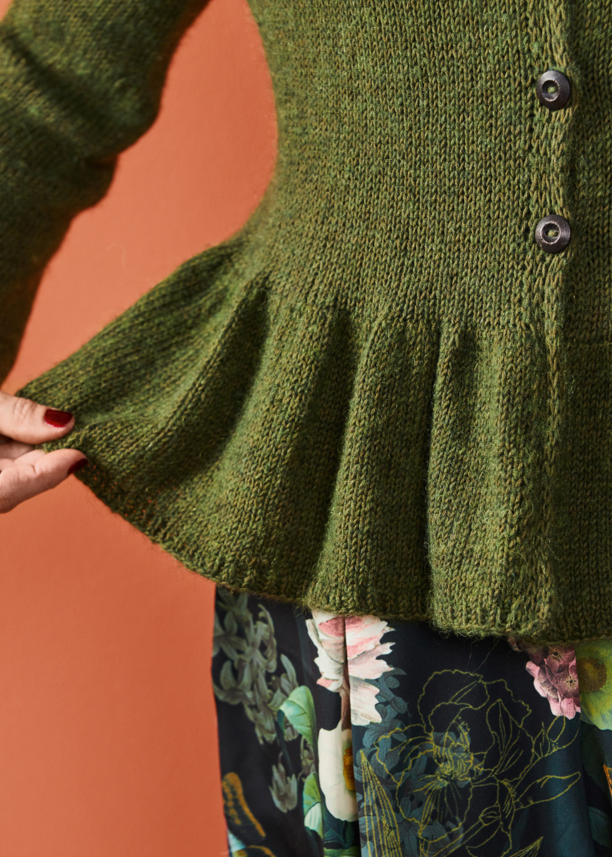 300 (300) 300 (350) 350 (400) 450 (500) Lana Grossa Ecopuno (72 % Baumwolle, 17 % Schurwolle, 11 % Alpaka (Baby)), Lauflänge 215 m/ 50 g) in der Farbe 1 Loden oder 31 Braunrot; Je 1 Rundstricknadel Nr. 4 und 4,5, 100 cm lang, Je 1 Rundstricknadel Nr. 4 und 4,5, 80 cm lang (für die Magic Loop Methode) oder je 1 Nadelspiel Nr. 4 und 4,5; 6 (6) 6 (6) 7 (7) 7 (7) Knöpfe, Durchmesser ca. 1,8 cm; eventuell Maschenmarkierer, 2 Maschenhalter und 1 Wollnadel.