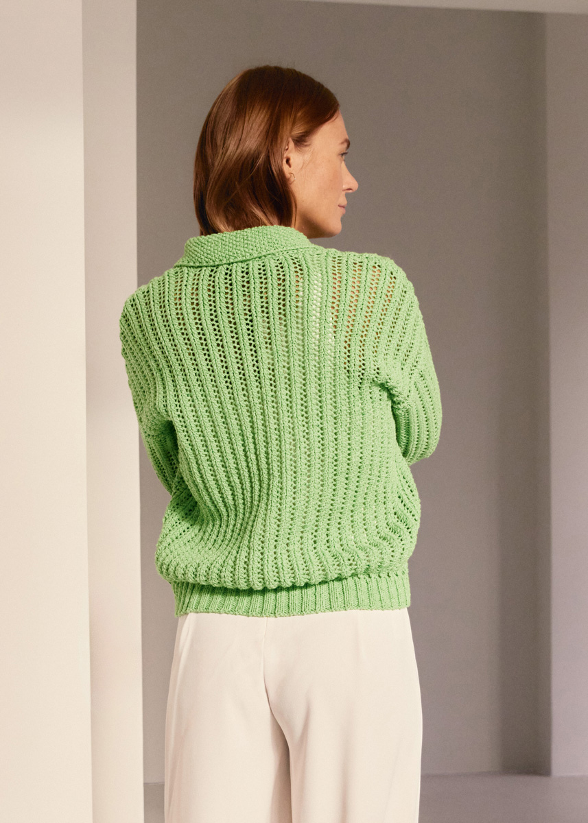 Polo-Kragen, leuchtendes Jadegrün und ein schnörkelloses Rippenlochmuster sorgen bei diesem Cardigan für modernen Chic. Gestrickt wird doppelfädig – so kommen Sie zügig voran.