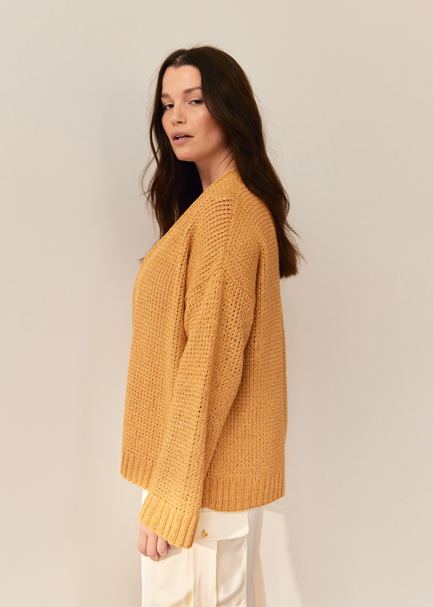 Der honiggelbe Strukturmuster-Cardigan (Anleitung bis Größe 48/50) hat eine gerade Passform mit dezentem V-Neck. Die vordere Blende wird mitgestrickt und im Nacken an den Halsausschnitt genäht.