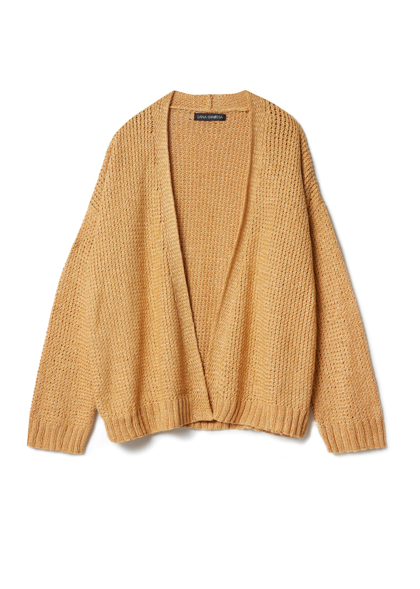 Lana Grossa Linarte (40% Viskose, 30% Baumwolle, 20% Leinen, 10% Polyamid, Lauflänge 125 m/50 g), 600 (650 – 700 – 750) g Honiggelb (Fb. 326); Stricknadeln Nr. 4,5.