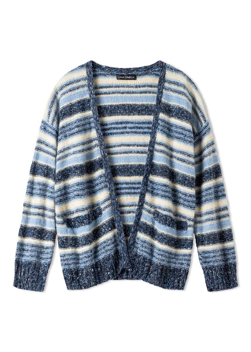 Lana Grossa „Maglia“ (92% Baumwolle, 8% Polyester, Lauflänge 155 m/50 g), 250 (250 - 300) g in Nachtblau/Schwarz/ Weiß/Grau/Hellblau (Fb. 9), Lana Grossa „Setasuri“ (69% Alpaka (Suri), 31% Seide, Lauflänge 212 m/25 g), 100 (125 - 125) g in Himmelblau (Fb. 44), Lana Grossa „Finito“ (73% Baumwolle, 27% Polyamid, Lauflänge 150 m/50 g), 100 (150 - 150) g in Hellbeige/ Creme (Fb. 8); Stricknadeln Nr. 3 und Nr. 4.
