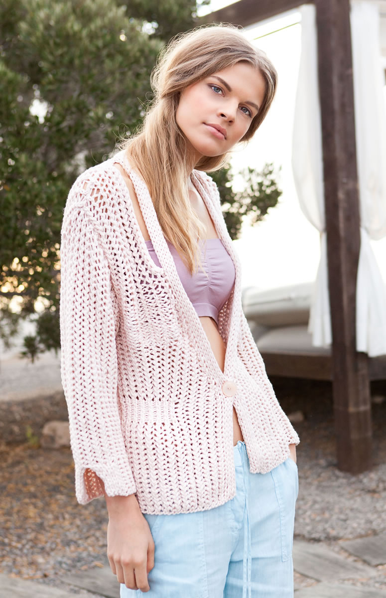 Lana Grossa-Qualität „Cashsilk” (40 % Polyamid, 30 % Bambus, 15 % Kaschmir, 15 % Seide, LL = ca. 75 m/50 g): ca. 500 (550) g Rosé (Fb. 50); Stricknadeln Nr. 7; 1 Knopf von Union Knopf, Art. 452570, 28 mm ø, Fb. 46 pfirsich.