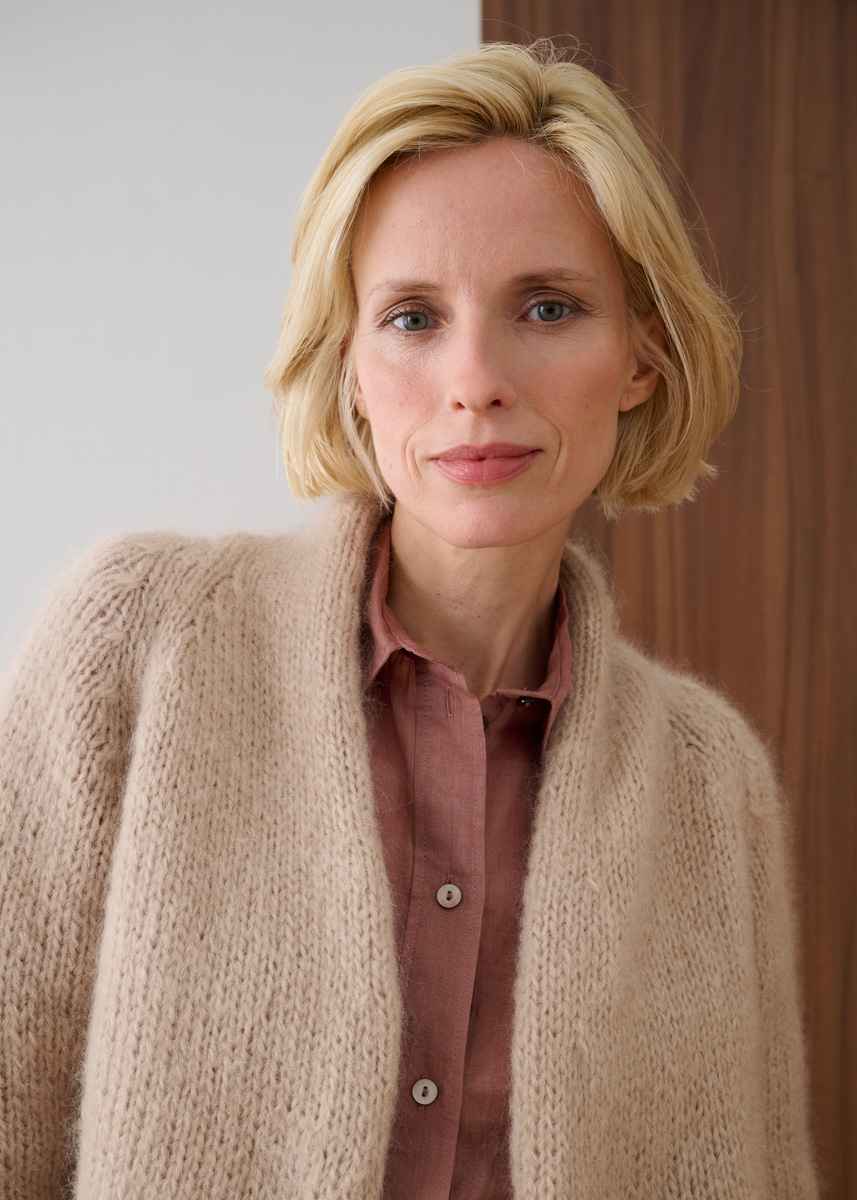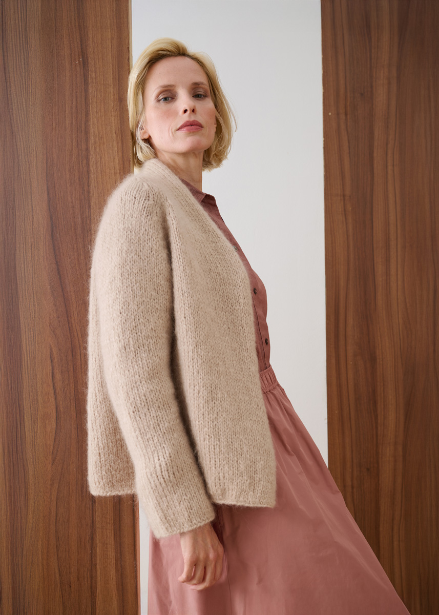 Lana Grossa Mohair di Gio (55% Mohair (Superkid), 45% Schurwolle (Merino superfein), Lauflänge 85 m/50 g), 450 (500 – 550) g Beige (Fb. 8); Stricknadeln Nr. 6,5 und 7.