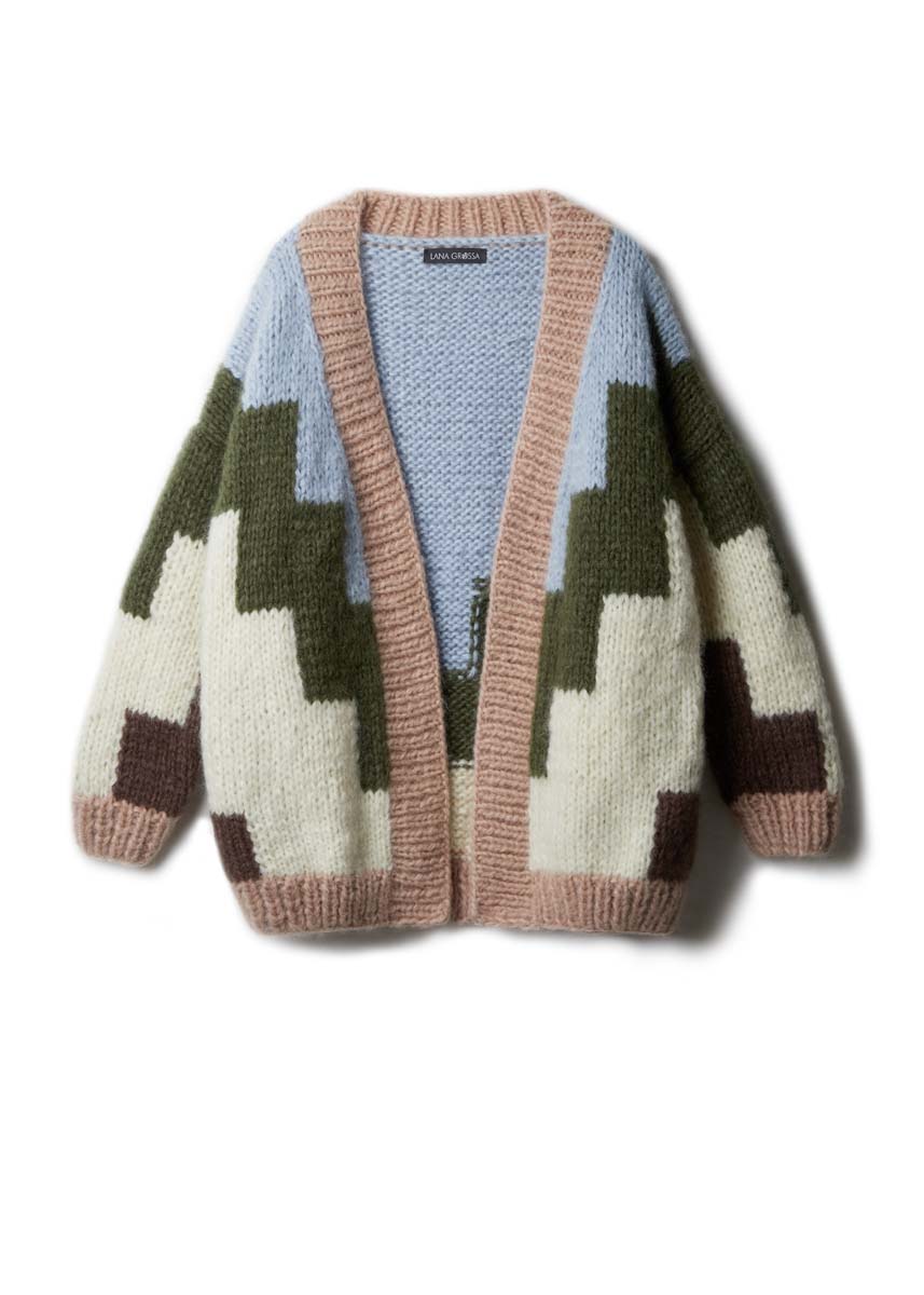 Lana Grossa Mohair Di Gio ca. 200 (200 - 250) g in Rohweiß (Fb 9), je ca. 100 (150 - 150) g in Beige (Fb 8), in Pastellblau (Fb 10) und in Farngrün (Fb 14), ca. 100 g in Graubraun (Fb 7). Stricknd Nr. 8 und Nr. 10; eine lange Rundstricknd Nr. 8 (für die vordere Blende).