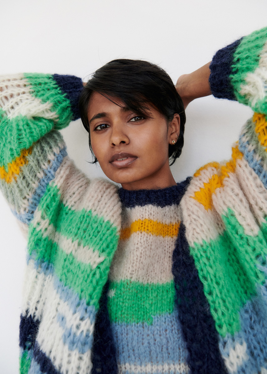Lana Grossa „Mohair Moda“ (70% Mohair (Kid Mohair), 20% Schurwolle (Merino superfein), 10 % Polyamid, Lauflänge 140 m/50 g), Fb-Variante 1: 100 g Nachtblau (Fb 5), 50 g Graugrün (Fb 3), 50 g Gelb (Fb 1), 50 g Rohweiß (Fb 18), 50 g Graublau (Fb 4), 100 g Lindgrün (Fb 2), 50 g Beige (Fb 11);