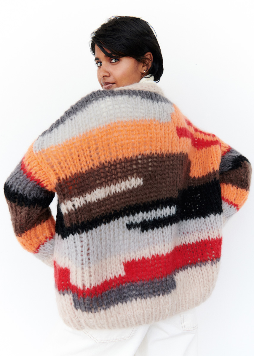 Fb-Variante 3: 150 g Rohweiß (Fb 18), 50 g Blau (Fb 6), 50 g Hellgrau (Fb 17), 50 g Pink (Fb 8), 50 g Schwarz (Fb 16), 50 g Fliederrosa (Fb 9), 50 g Violett (Fb 7); Stricknadeln Nr 10 und 15.
