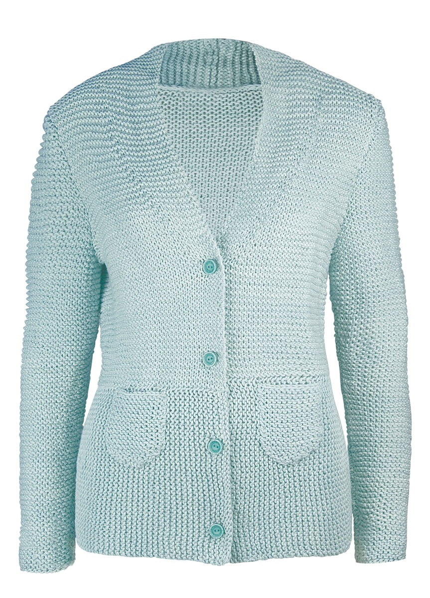 Lana Grossa-Qualität „Organico” (100 % (Bio) Baumwolle, LL = ca. 90 m/50 g): ca. 550 (600 – 650) g Eisblau (Fb. 82); Stricknadeln Nr. 5,5, 1 Rundstricknadel Nr. 5,5, 100 cm lang; 4 Knöpfe von Union Knopf, Art. 452227, 18 mm Ø, Fb. 32 helltürkis.