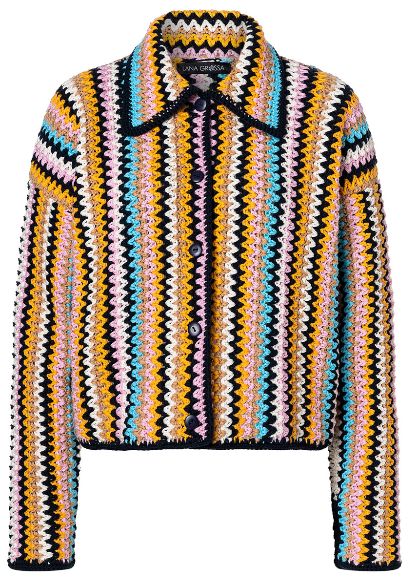 Softeisfarben, etwas Schwarz und ein großer Umlegekragen bescheren dem kastigen Cardigan modernen Retro-Appeal. Praktisch: Das Zackenmuster entsteht durch luftige Stäbchen, die obendrein als Knopflöcher dienen.