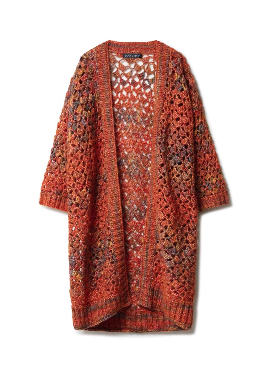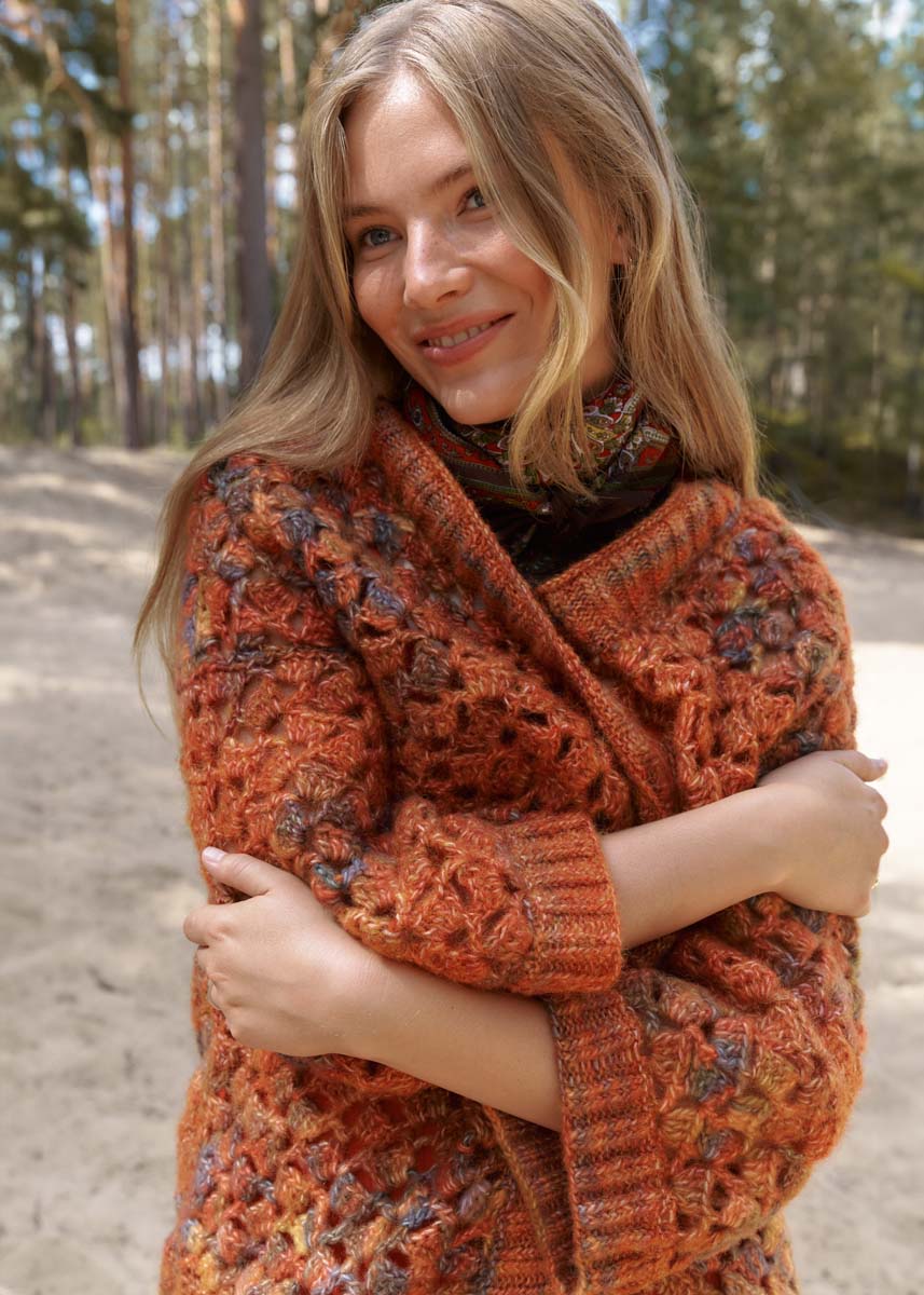 Wir feiern den Indian Summer – mit Verlaufsgarn in Herbstlaubtönen und einem Stäbchenmuster, das an kleine Blätter erinnert. Der Cardigan hat einen V-Ausschnitt, ansonsten besteht er aus geraden Teilen