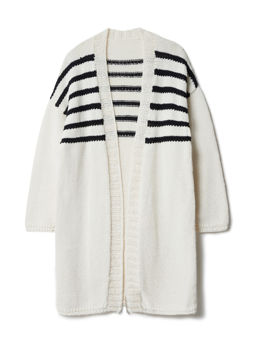 Beim glatt rechts gestrickten Cardigan bringt ein Dominomuster schwarze Streifen auf Zack. Abgerundet wird das schlanke Anfänger-Piece von überschnittenen Power-Schultern.