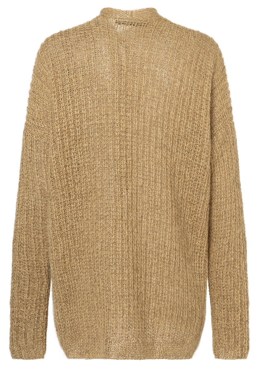 Eine schlichte Form, seidiger Mohair-Mix in Camel und ein goldglänzendes Beilaufgarn: Hier gibt es vom Guten nur das Beste.