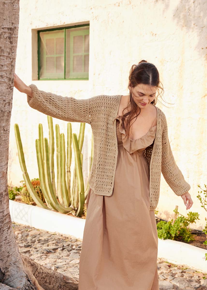 Dieser Cardigan besteht überwiegend aus luftigen Doppelstäbchen. Summer Softness (neu) garantiert schnelle Häkelergebnisse und macht das Modell weich und leicht.