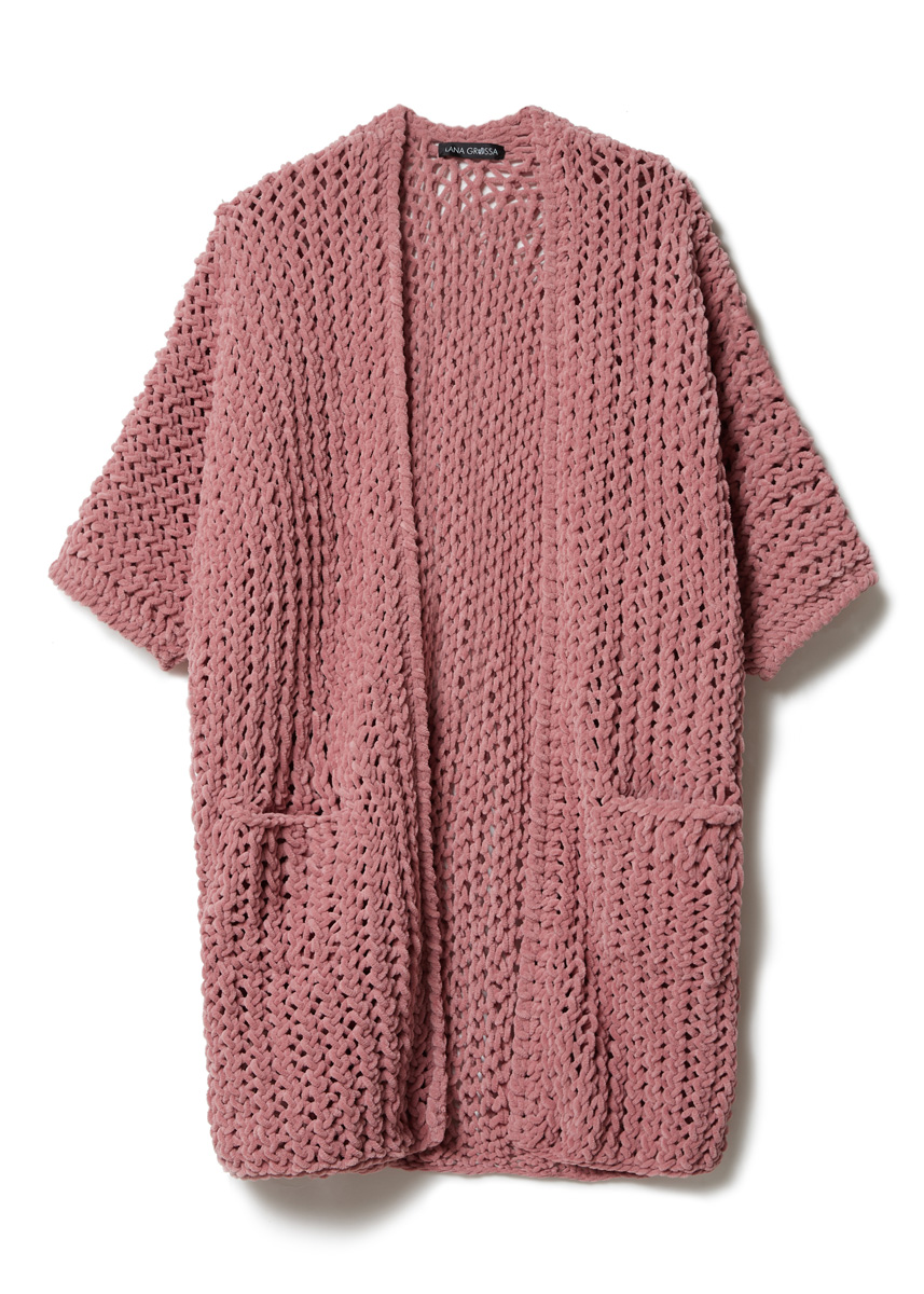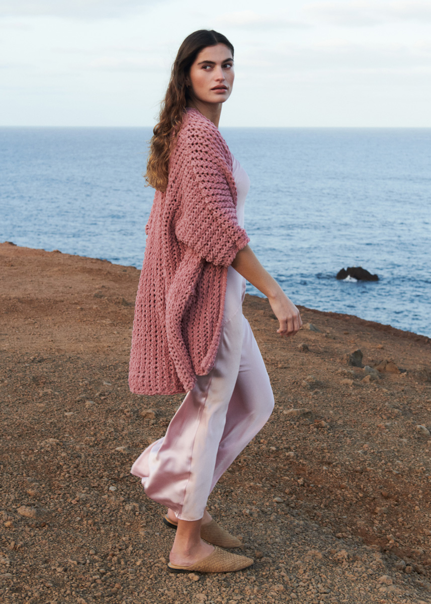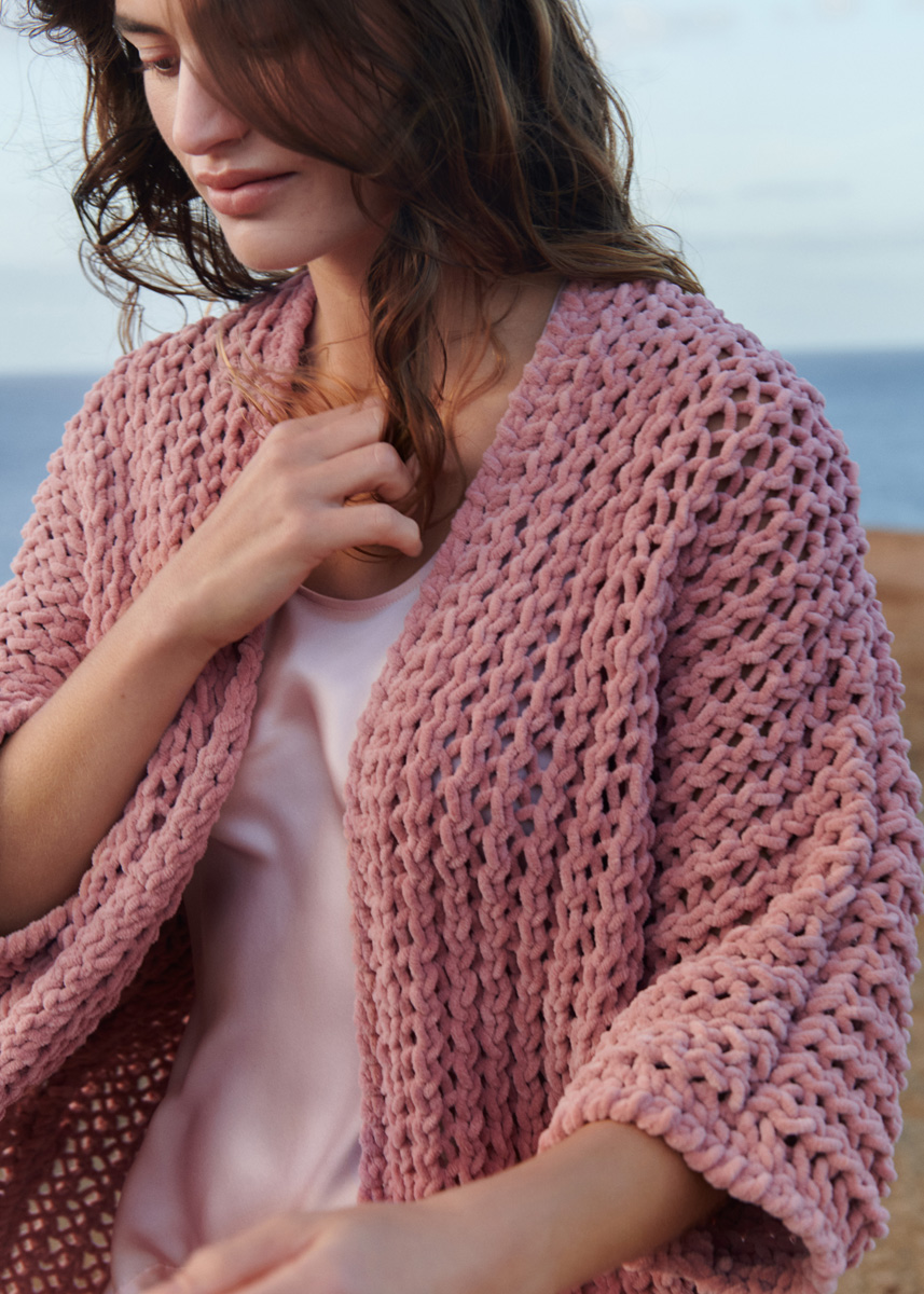 Dieser Lochrippenmuster- Cardigan hat eine unkomplizierte, gerade Form mit angestrickten Dreiviertelärmeln. Für die samtigvoluminöse Optik sorgt ein neues, rundes Chenille-Garn.