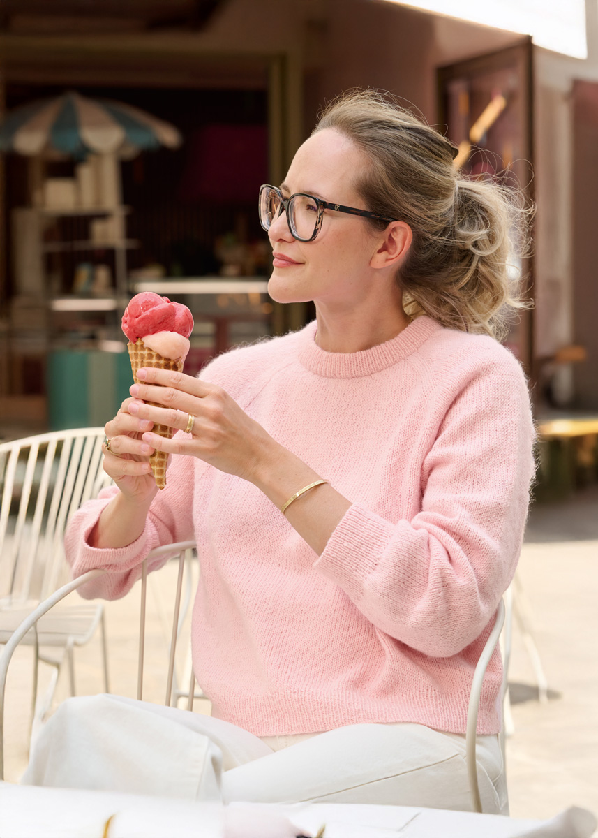 Lana Grossa Ecopuno 72 % Baumwolle, 17 % Schurwolle (Merino), 11 % Alpaka (Baby), LL = 215 m / 50 g in Apricot (Fb. 99), Rosa (Fb. 48) oder Kirschrot (Fb. 47). Eine Rundstricknadel der Stärke 3,5 mm oder 4,0 mm, eine Rundstricknadel um 1,5 – 2 Stärken weniger für die Bündchen, Seillängen zwischen 40 und 100 cm, je nach Größe und abhängig von der Stricktechnik, je ein Nadelspiel in beiden Stärken für die Ärmel und Bündchen, 9 Maschenmarkierer: MM0 bis MM8 Maschenkordel oder Seil zum Stilllegen der Ärmelmaschen.