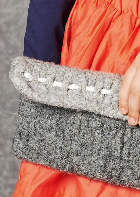 Lana Grossa Qualität „Feltro“ (100% Schurwolle, LL = 50 m/50 g), je ca. 50 g Grau meliert (Fb 3) und Dunkelgrau meliert (Fb 4), 1 Spiel Stricknadeln Nr. 8, 2 Druckknöpfe, ca. 24 cm weiße Spitze.