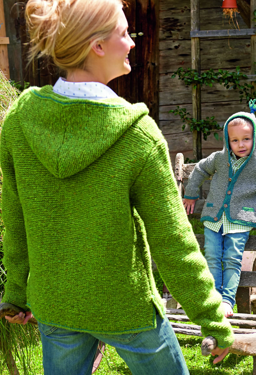 Lana Grossa-Qualität „Royal Tweed” (100 % Schurwolle (Merino fine), LL = ca. 100 m/50 g): ca. 750 (800) g Hellgrün meliert (Fb. 52) und Lana Grossa-Qualität „Ascot” (57 % Schurwolle, 18 % Polyamid, 25 % Viskose, LL = ca. 120 m/50 g): ca. 50 g Türkis meliert (Fb. 11); Stricknadeln Nr. 4, je 1 Rundstricknadel Nr. 4, 60 und 120 cm lang; Kokosknöpfe von Union Knopf, Art. 45959, 7x 23 mm ø und 1x 27 mm ø, Fb. 18 braun/natur gemustert.