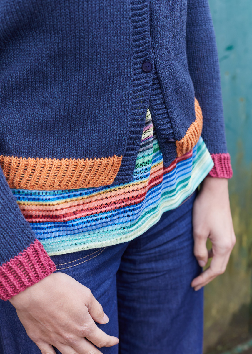 Lana Grossa-Qualität „Landlust Sommerseide“ (50% Seide, 50% Baumwolle, LL ca. 170 m/50 g), 250 (300 - 350 - 400) g Schwarzblau (Fb 9) und je 50 g Orange (Fb 10), Rot-Rosa (Fb 20) und Weinrot (Fb 12); Stricknadeln Nr. 3,5 und Nr. 4, 1 Rundstricknadel Nr. 4, 50 cm lang; 6 blaue Knöpfe, 12 mm Durchmesser.