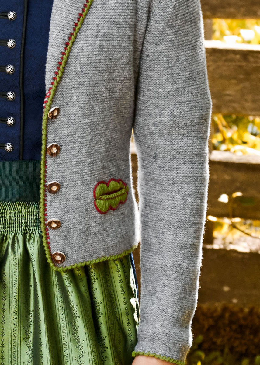 Lana Grossa-Qualität „Cashmere 16 Fine” (80 % Schurwolle (Merino), 10 % Kaschmir, 10 % Polyamid, LL = ca. 320 m/50 g): ca. 300 (350 – 400) g Hellgrau (Fb. 15) und Lana Grossa-Qualität „Meilenweit 50” (80 % Schurwolle, 20 % Polyamid, LL = ca. 210 m/50 g): je ca. 50 g Gelbgrün (Fb. 1362) und Dunkelrot (Fb. 1323); Stricknadeln Nr. 2,5, 1 Rundstricknadel Nr. 2,5, 60 cm lang, je 1 Wollhäkelnadel Nr. 2,5 und 3; 1 Wollnadel zum Sticken von Lana Grossa; 5 Hornknöpfe von Union Knopf, Art. 25256, 20 mm ø, Fb. 22 dunkelbraun/natur.