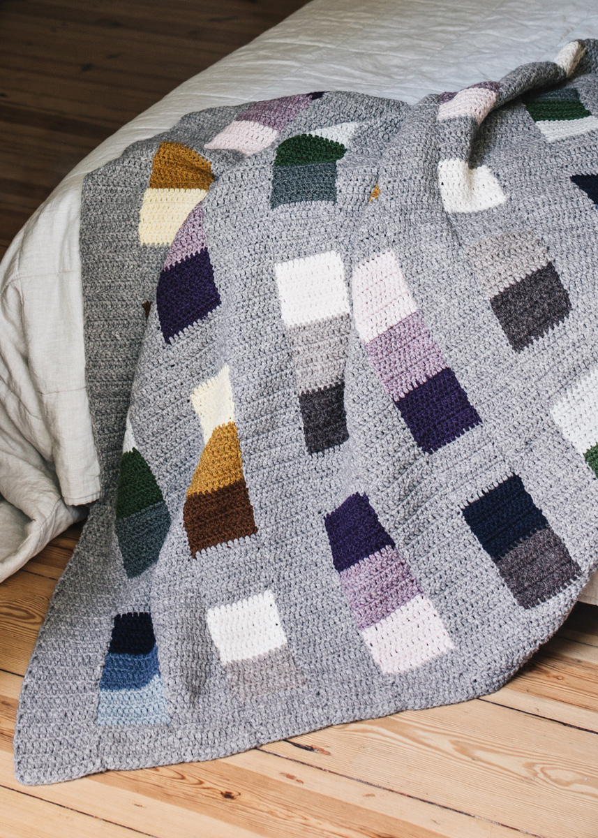 Erinnert an eine Pantone-Farbkarte: Das grafisch gemusterte Plaid aus zusammengenähten Häkelbahnen ist perfekt für Design-Fans, die es reduziert und aufgeräumt mögen.