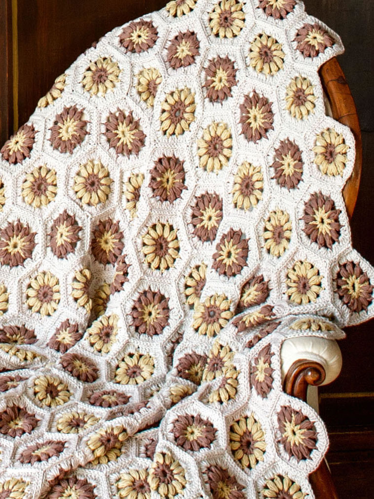 Einzeln gestrickte Mosaike verwandeln diese Decke in ein Blütenmeer. Hübscher Nebeneffekt: der dekorative Zackenrand.