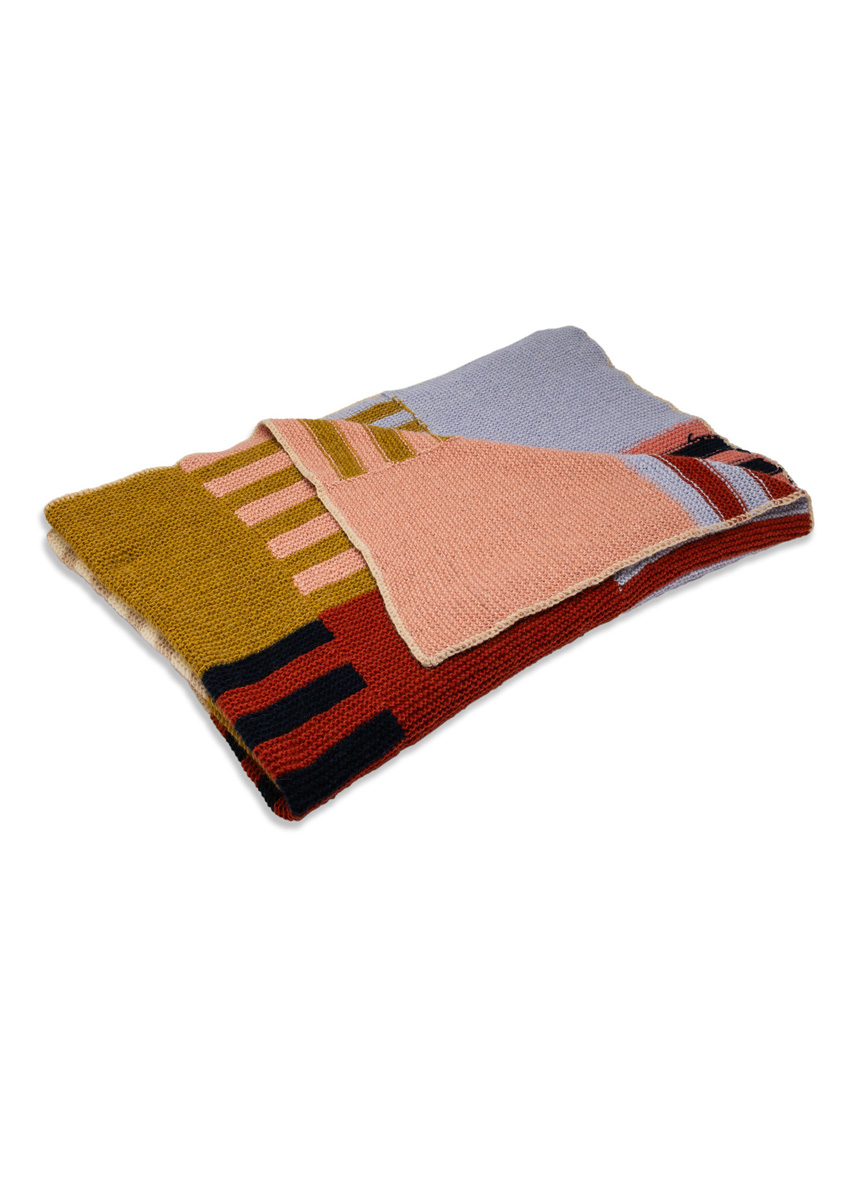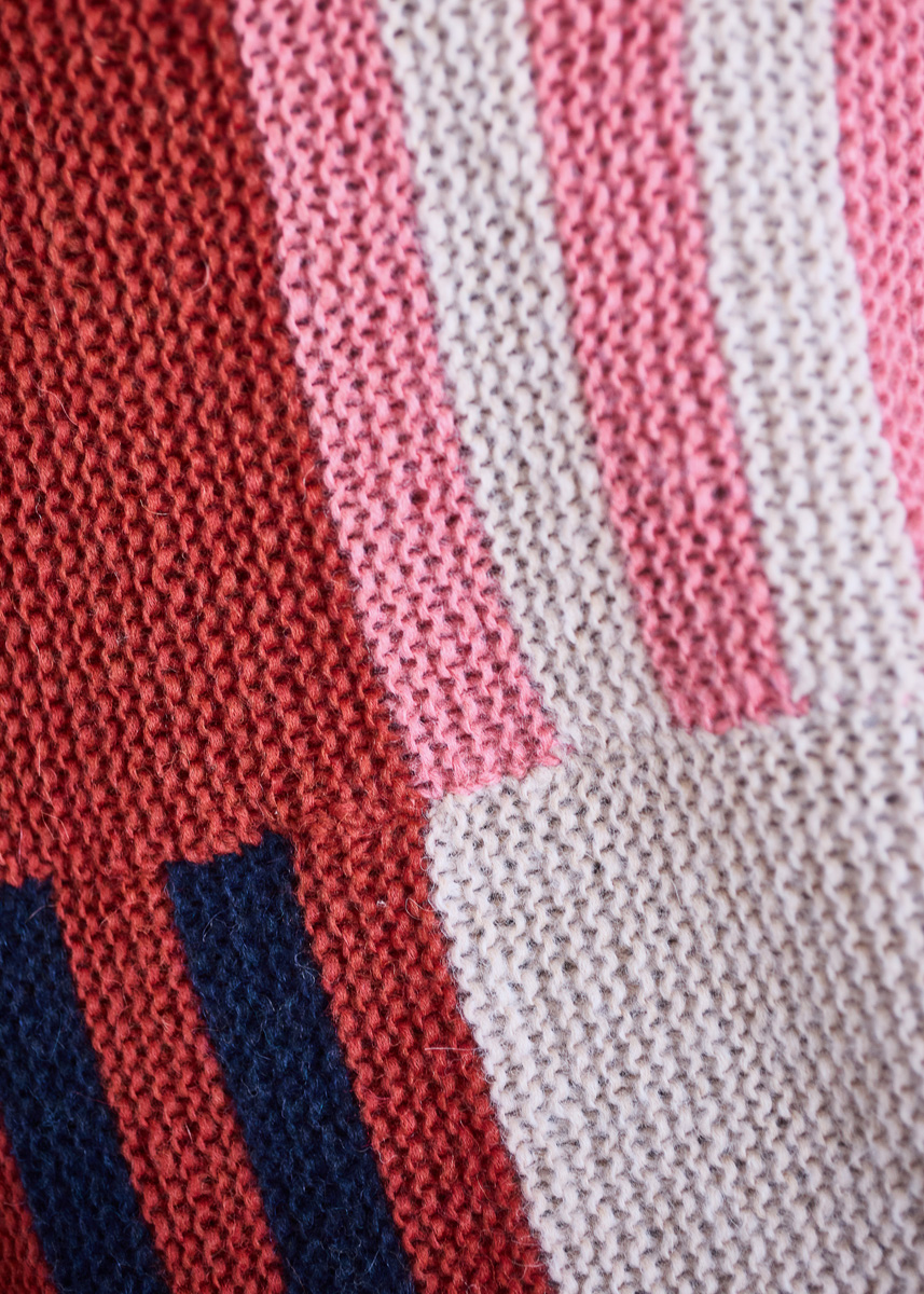 Lana Grossa-Qualität „Brigitte No. 2” (47 % (Baby) Alpaka, 45 % Baumwolle, 8 % Schurwolle (Merino), LL = ca. 140 m/50 g): je ca. 250 g Nachtblau (Fb. 5) und Hellbeige (Fb. 47), je ca. 200 g Rohweiß (Fb. 16), Senfgelb (Fb. 67), Rost (Fb. 59) und Zartlila (Fb. 78) und je ca. 150 g Lachs (Fb. 46) und Pfirsich (Fb. 55); 1 Rundstricknadel Nr. 6, 120 cm lang, 1 Wollhäkelnadel Nr. 5.
