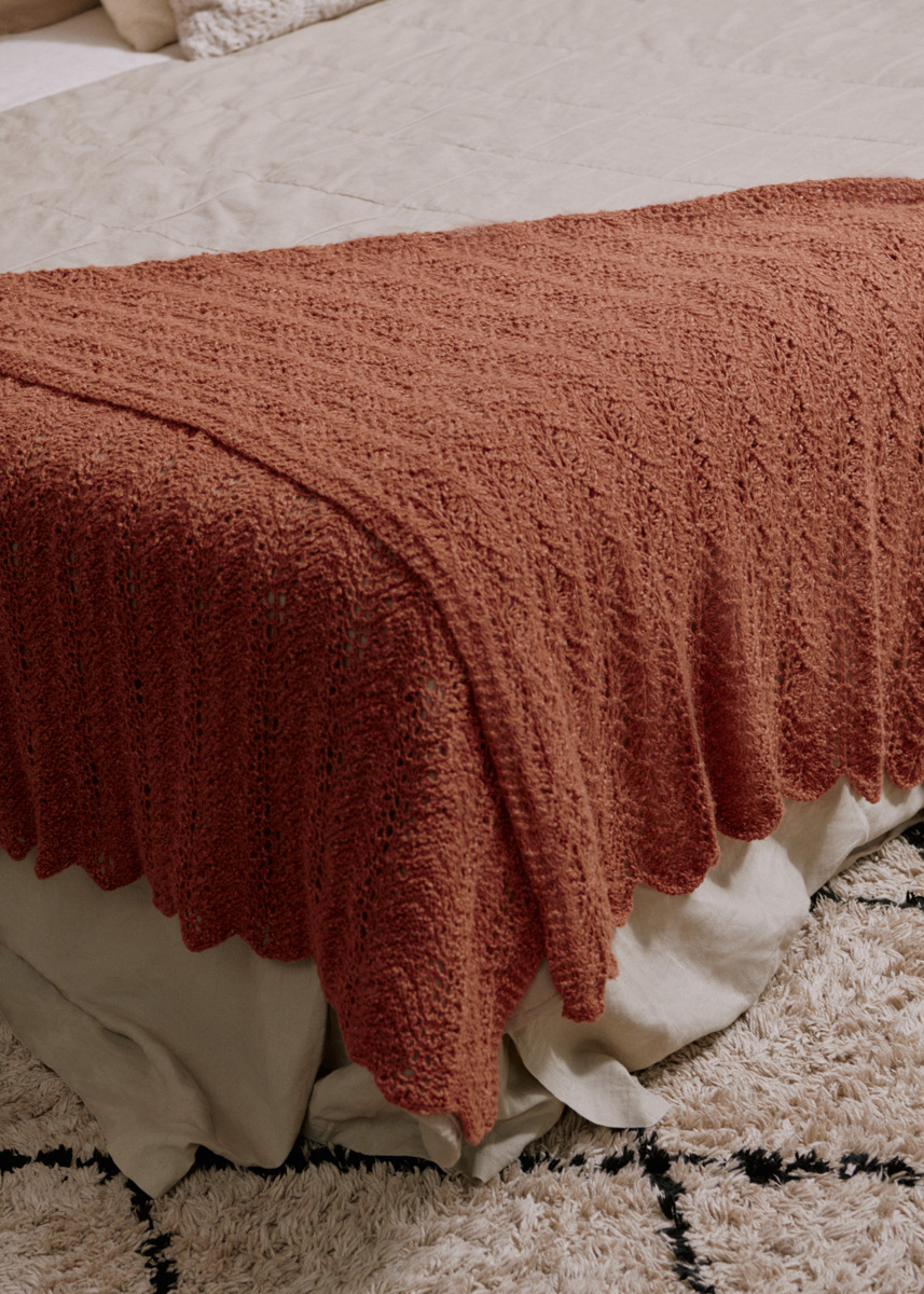 Lana Grossa-Qualität „Fantasia“ (50 % Baumwolle, 24 % Viskose, 16 % (Baby) Alpaka, 10 % Schurwolle Merino (Extrafine), LL = ca. 125 m/50 g): ca. 900 g in Kupfer (Fb. 7); 1 Rundstricknadel Nr. 4, 120 cm lang.