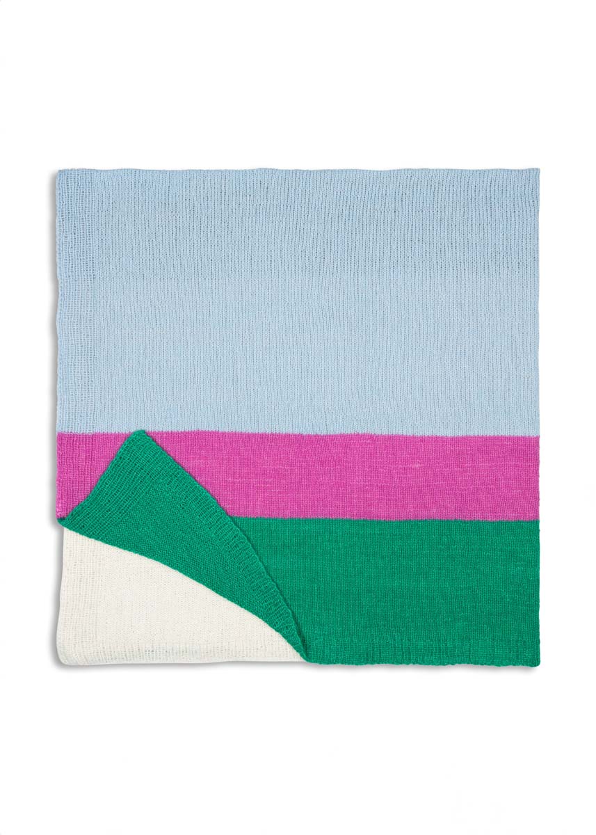 Lana Grossa-Qualität „Soffio” (60 % Schurwolle (Merino superfeiin), 30 % (Bio) Baumwolle, 10 % Kaschmir, LL = ca. 215 m/25 g): ca. 125 g Hellblau (Fb. 13), ca. 100 g Rohweiß (Fb. 18), je ca. 75 g Hellbeige (Fb. 17), Beige (Fb. 16) und Grün (Fb. 9) und ca. 50 g Fuchsia (Fb. 2); 1 Rundstricknadel Nr. 4, 120 cm lang.