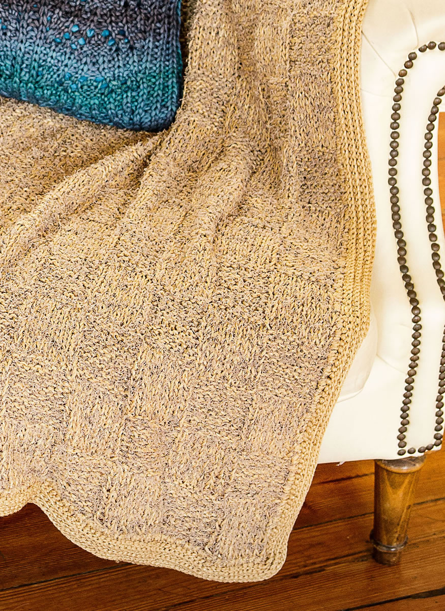 Schachbrettmuster, Fransen- und Matt-Glanz-Garn sorgen hier für Raffinesse. Der Naturton passt zu allem.