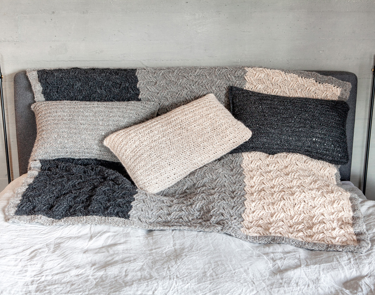 Lana Grossa-Qualität „Cloud” (80 % Alpaka, 14 % Schurwolle (Merino), 6 % Polyamid, LL = ca. 80 m/50 g): je ca. 300 g Anthrazit (Fb. 13) und Beige (Fb. 2) und ca. 350 g Taupe (Fb. 22); je 1 Rundstricknadel Nr. 6 und 6,5, 120 cm lang.