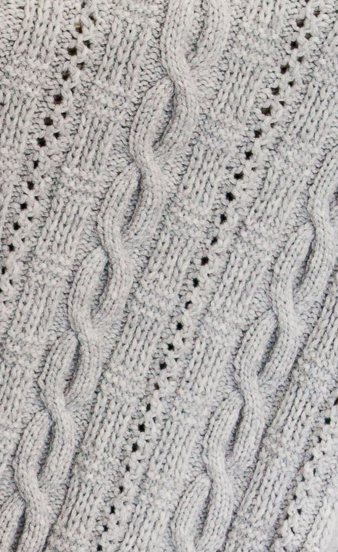 Lana Grossa-Qualität „Alta Moda Cashmere 16” (78 % Schurwolle 16 μ, 12 % Kaschmir, 10 % Nylon, LL = ca. 110 m/50 g): ca. 1300 g Hellgrau meliert (Fb. 1); 1 Rundstricknadel Nr. 7, 100 cm lang.