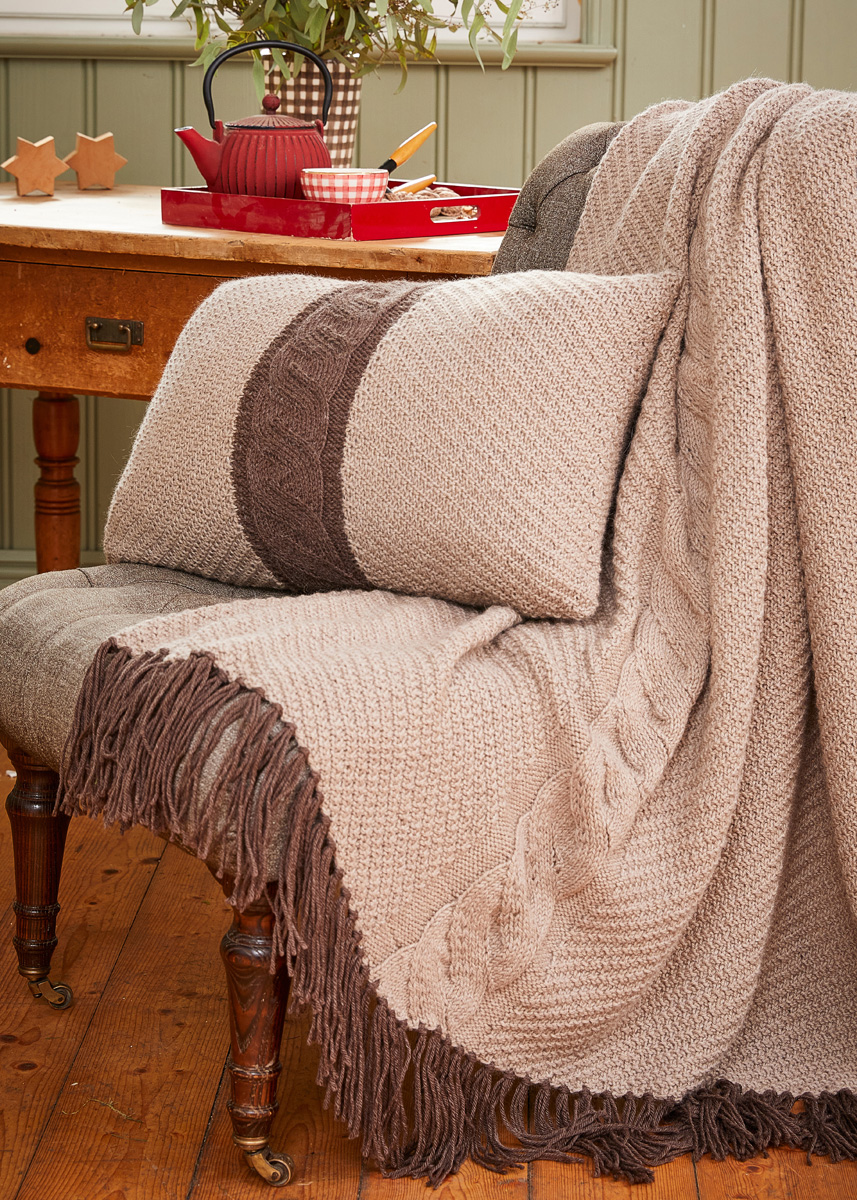 Lana Grossa-Qualität „Landlust Alpaka Merino 100“ (50% Baby Alpaka, 50% Schurwolle Merino filzfrei, LL ca. 100 m/50 g), für die Decke 900 g in Taupe (Fb 304) und 100 g in Graubraun (Fb 305), je 1 Rundstricknadel Nr. 5, 60 cm bzw. 120 cm lang, 1 Häkelnadel Nr. 4 für das Einknüpfen der Fransen;