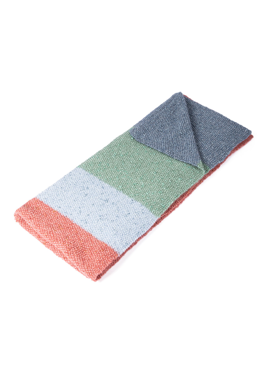 Lana Grossa-Qualität „Lucciola” (29 % Polyamid, 24 % Schurwolle (Merino Fine), 22 % Viskose, 20 % (Baby) Alpaka, 5 % metallische Faser, LL = ca. 130 m/50 g): ca. 500 g Terrakotta (Fb. 9), je ca. 150 g Grün (Fb. 3) und Hellblau (Fb. 5) und ca. 100 g Graublau (Fb. 4); 1 Rundstricknadel Nr. 5, 120 cm lang.