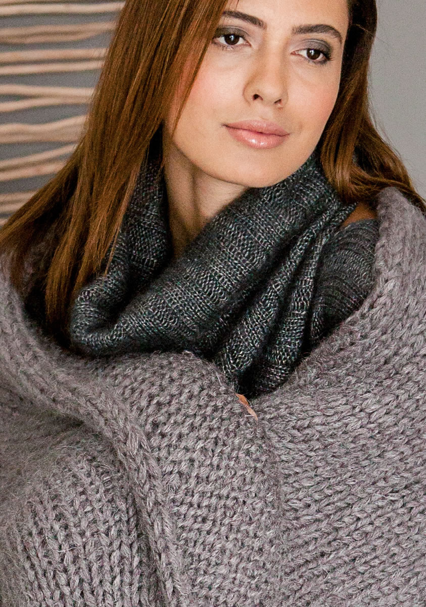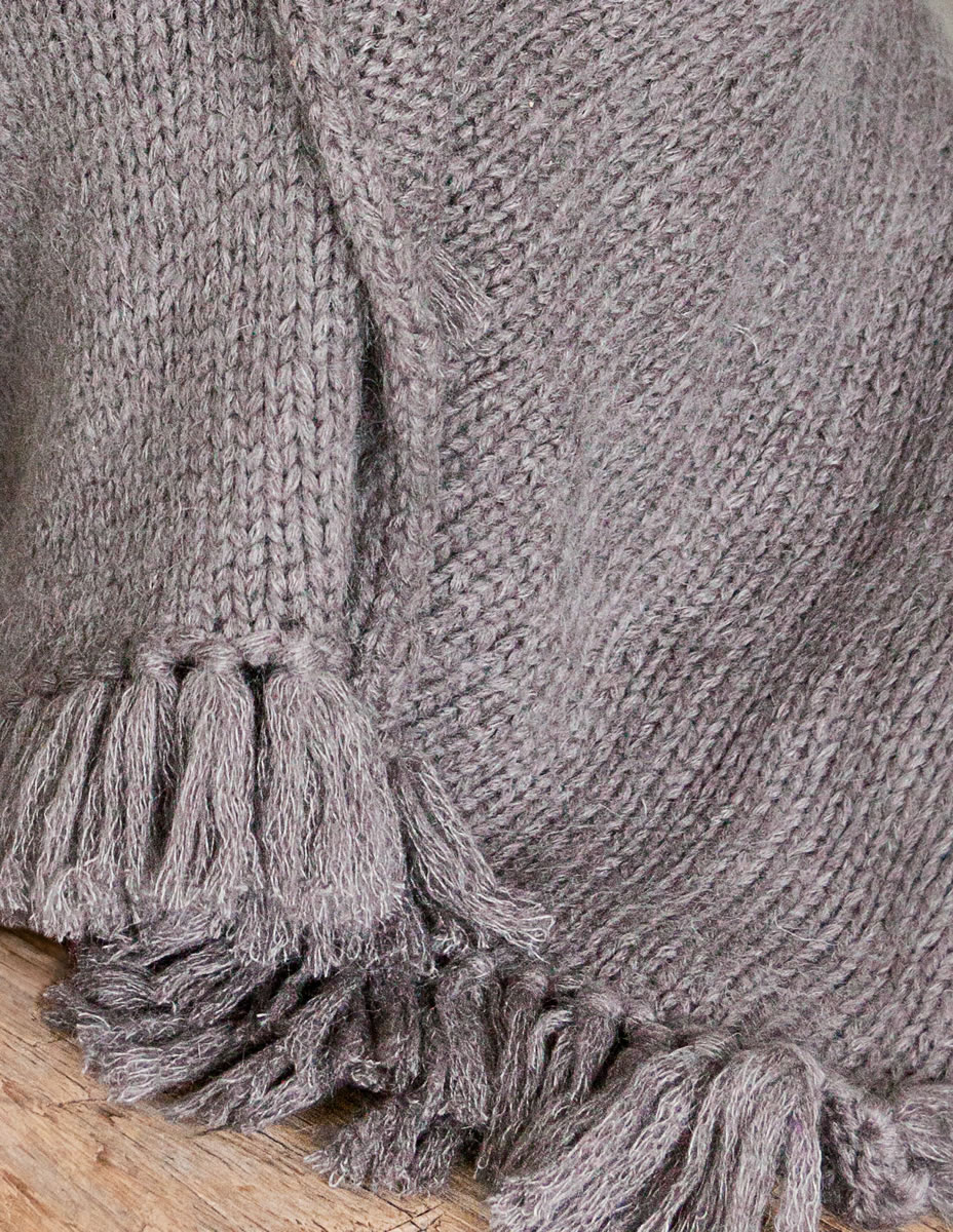 Lana Grossa-Qualität „Molle” (40 % Polyacryl, 30 % Mohair, 30 % Polyamid, LL = ca. 60 m/100 g): ca. 1400 g Taupe (Fb. 11) (1600 g Zyklam (Fb. 5)); 1 Rundstricknadel Nr. 15, 100 cm lang, 1 Wollhäkelnadel Nr. 12 zum Einknüpfen der Fransen.