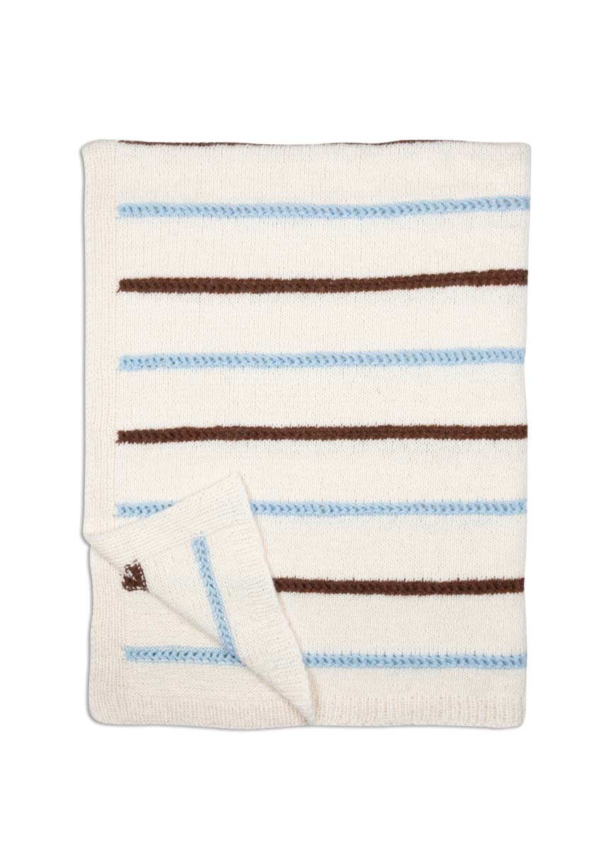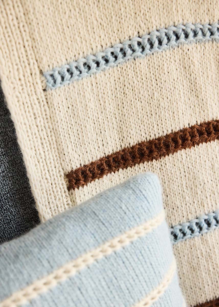Lana Grossa-Qualität „Brigitte No. 2” (47 % (Baby) Alpaka, 45 % Baumwolle, 8 % Schurwolle (Merino), LL = ca. 140 m/50 g): ca. 700 g Rohweiß (Fb. 16) und je ca. 100 g Schokobraun (Fb. 68) und Lichtblau (Fb. 65); 1 Rundstricknadel Nr. 5, 120 cm lang.