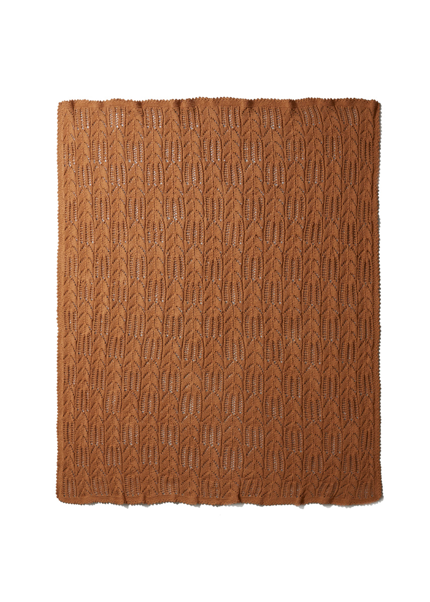 Die Decke (ca. 150 x 160 cm) wurde im Ajour-Blattmuster gestrickt. Sie besteht aus zertifizierter Bio-Baumwolle in Camel und hat einen Häkelrand mit feinen Pikots.