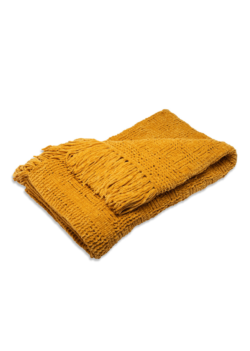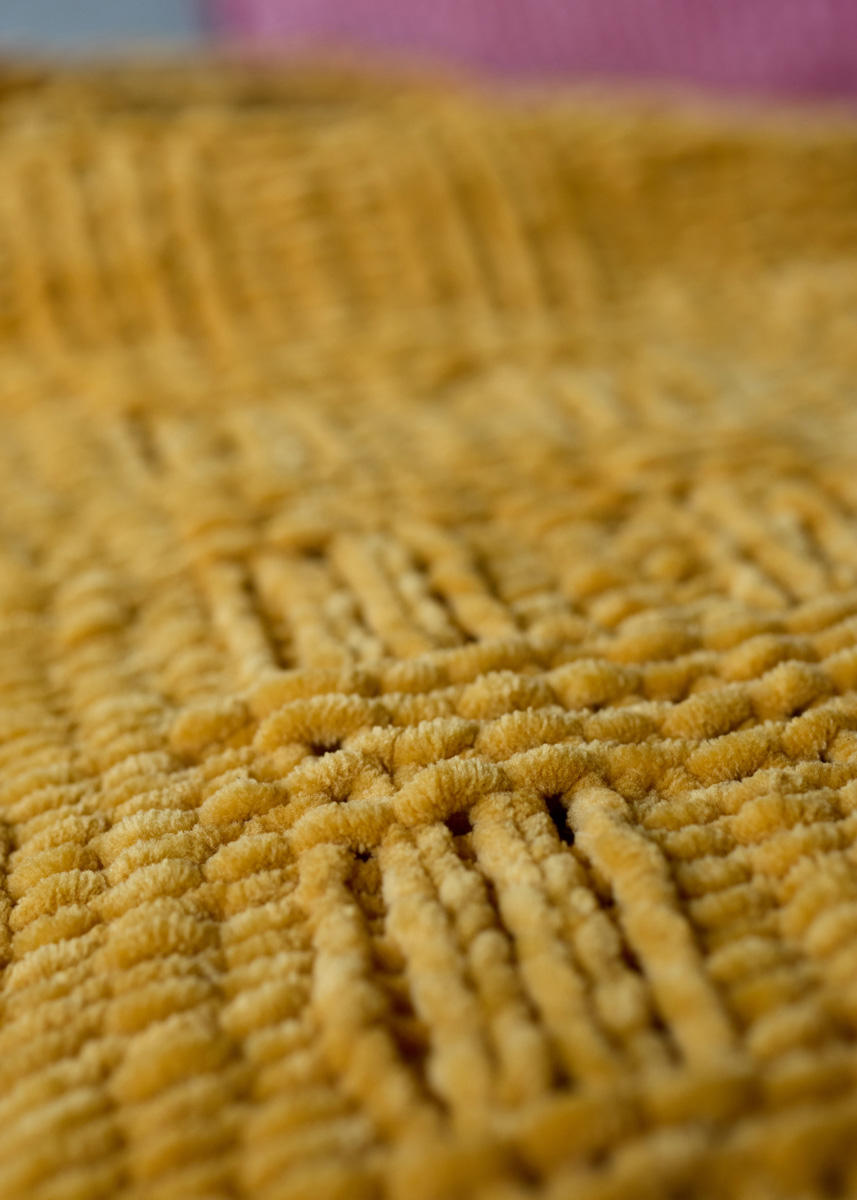 Lana Grossa-Qualität „The Look” (100 % Polyester, LL = ca. 120 m/100 g): ca. 1100 g Safrangelb (Fb. 32); 1 Rundstricknadel Nr. 7, 120 cm lang, 1 Wollhäkelnadel Nr. 8 zum Einziehen der Fransen.