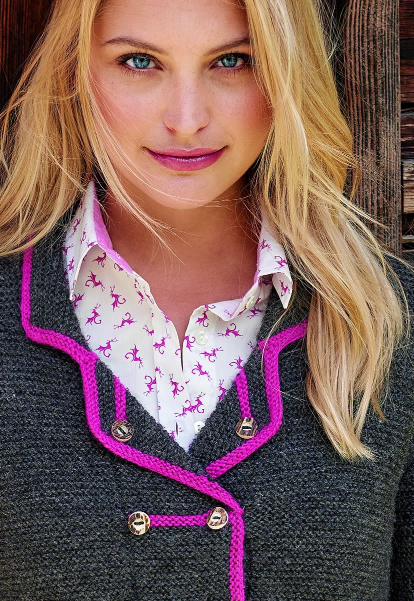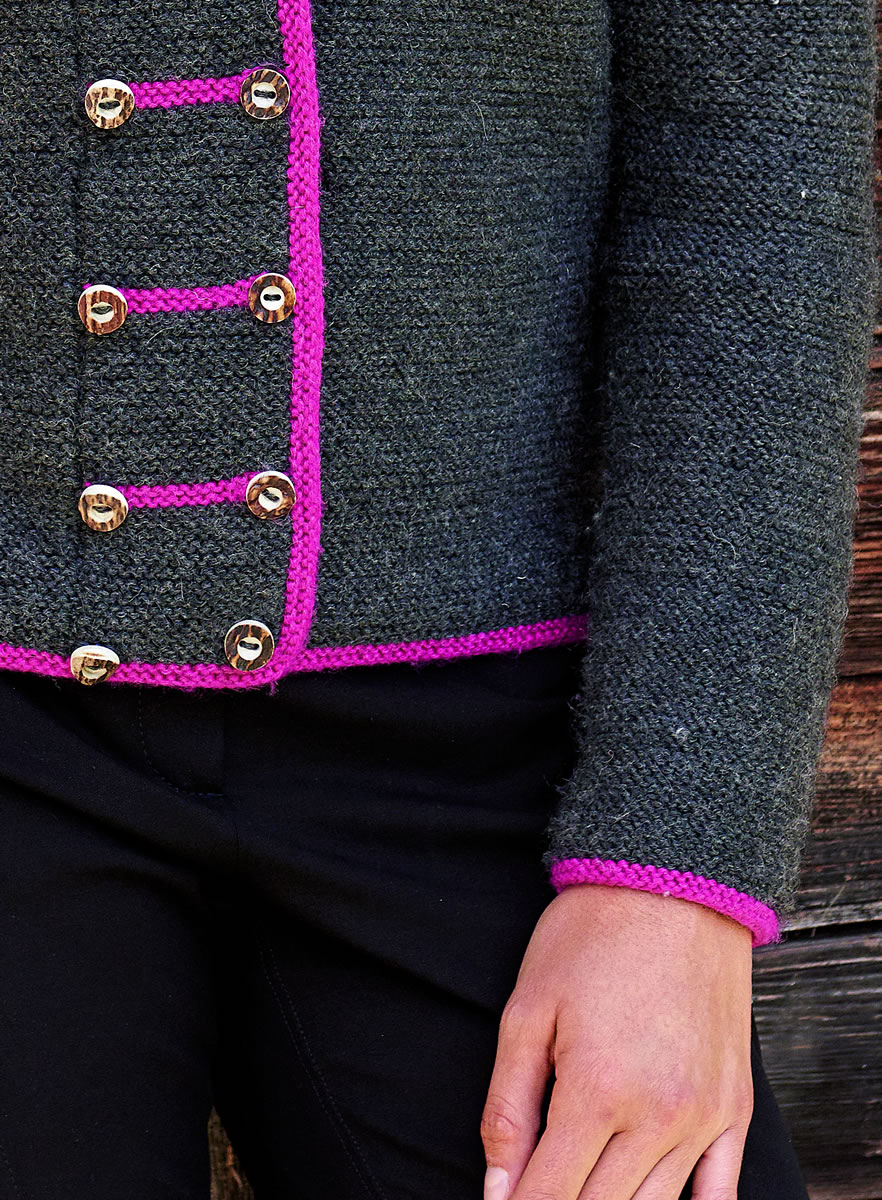 Sieht schon recht gut aus, der traditionelle Strickjanker. Vor allem, wenn er etwas „aufgestylt” ist. Joana hat ihn links gestrickt und einen schmucken Zweireiher daraus gemacht. Mit den pinkfarbenen Applikationen macht er recht was her!