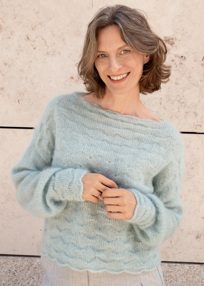 Der Dreamcloud Sweater ist ein femininer, moderner Pullover mit kastiger Passform und einem ausdrucksstarken Strukturmuster, das an kleine, weiche Wolken erinnert. Gewellter Kragen und Saum, extravagante Bündchen sowie Ärmel mit leichtem Ballon-Effekt verleihen dem Design eine besondere Leichtigkeit. Die modifizierte Drop-Shoulder-Konstruktion sorgt für Volumen, ohne klobig zu wirken.