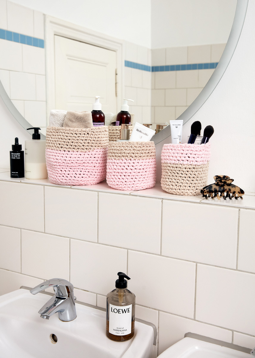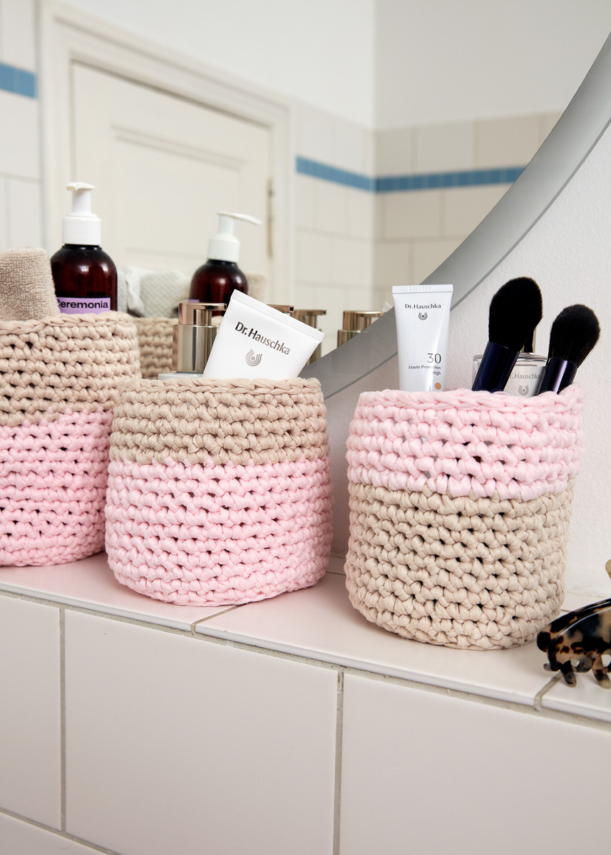 Lana Grossa-Qualität „The Paper” (70 % Polyester, 30 % Viskose, LL = ca. 100 m/100 g): für den großen Korb: je ca. 100 g Rosa (Fb. 12) und Beige (Fb. 2), für die 2 kleinen Körbe zusammen: je ca. 100 g Rosa (Fb. 12) und Beige (Fb. 2); 1 Wollhäkelnadel Nr. 8.
