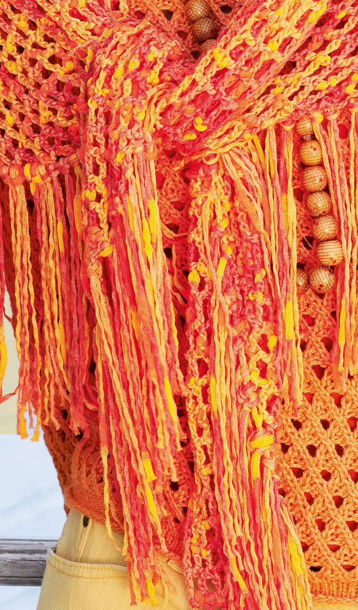 Lana Grossa-Qualität „Flu” (85 % Viskose, 15 % Polyester, LL = ca. 120 m/50 g): ca. 300 g Goldgelb/Neonrot/Himbeer/Neonorange (Fb. 2); 1 Wollhäkelnadel Nr. 5.