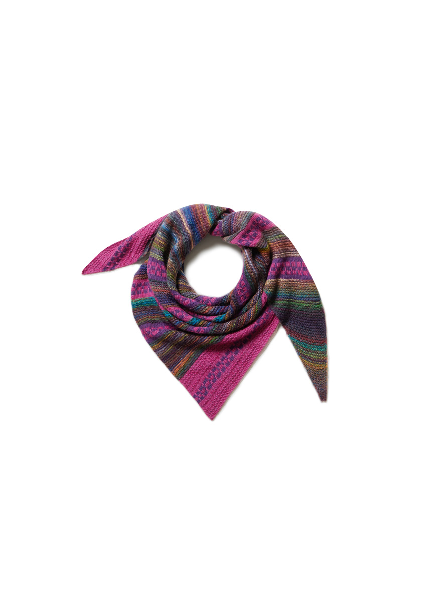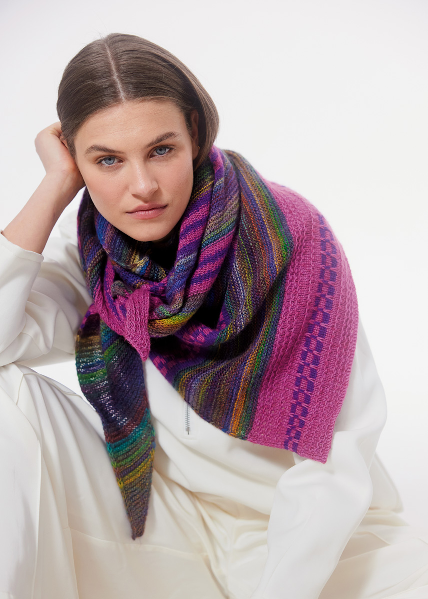 Lana Grossa Colorissimo (100% Schurwolle (Merinon Fine), Lauflänge 300 m/100 g), 300 g Jeans/Aubergine/Gelb/Gelbgrün/Schokobraun/Dunkelrot/Royal/Grün/Orange/Türkis (Fb. 211) und Lana Grossa Ecopuno (72% Baumwolle, 17% Schurwolle (Merino), 11% Alpaka (Baby), Lauflänge 215 m/50 g), 100 g Orchidee (Fb. 209) und 50 g Violett (Fb. 206); 1 Rundstricknadel Nr. 4, 80 – 100 cm lang.