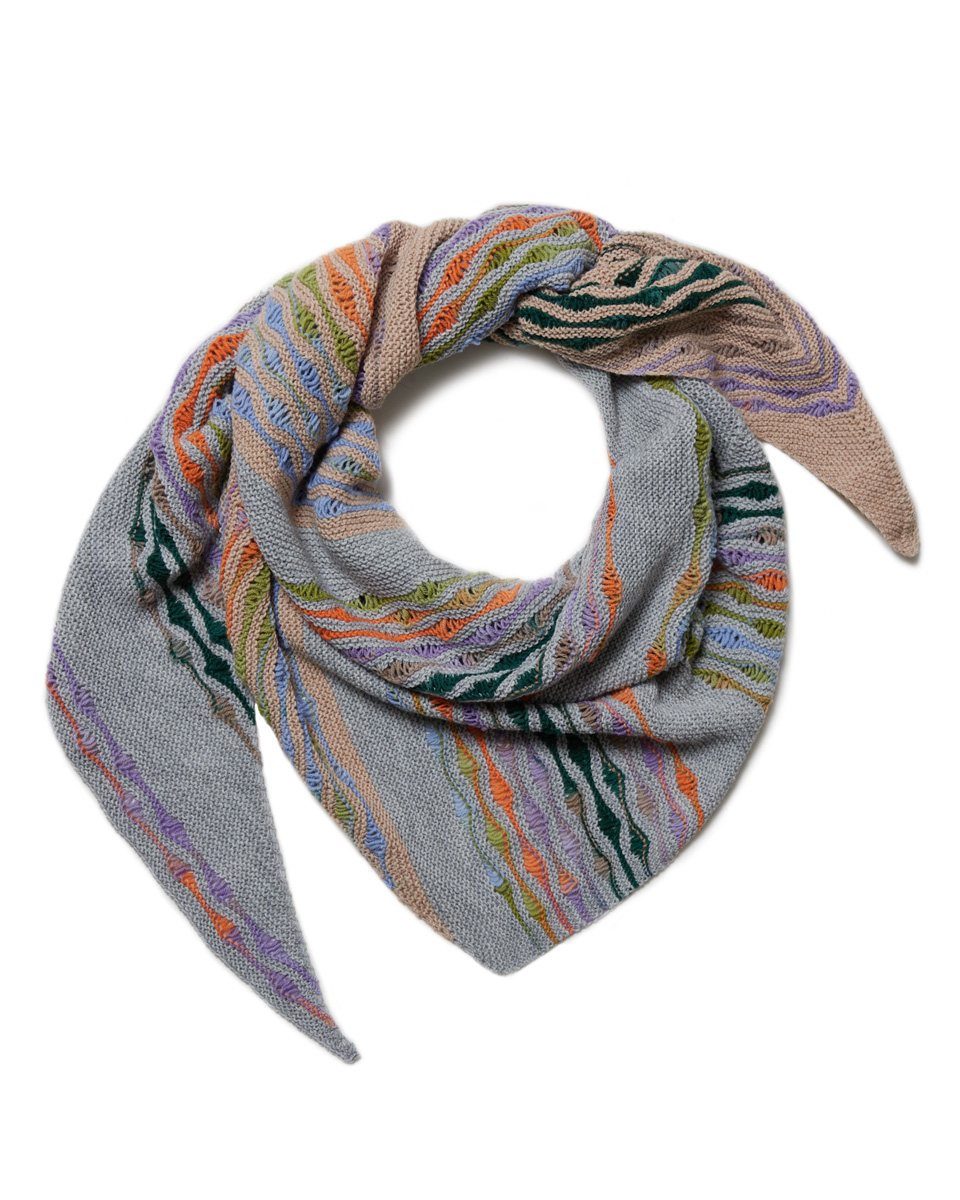 Ein Paradebeispiel für die international gefeierten Designs von Melanie! Über das großzügig geschnittene Tuch rauschen farbenfrohe Wellen. Fallmaschen lockern sie optisch auf und ermöglichen den durchscheinenden Effekt. Der neutrale Grundton bringt Ruhe rein.