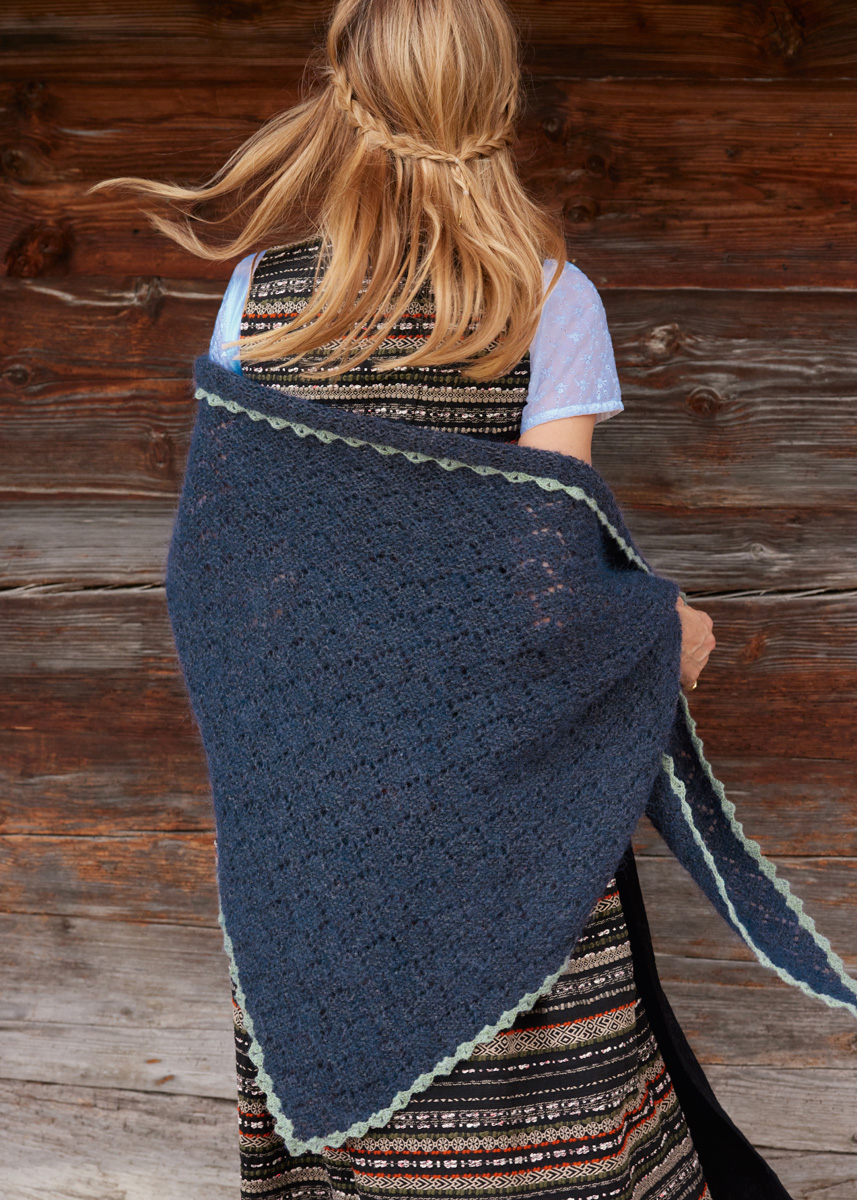 Das flauschige, dunkelgraue Dreieckstuch präsentiert sich mit einem verspielten Rautenlochmuster. Effektvoll: der gehäkelte Bogenrand in Resedagrün.
