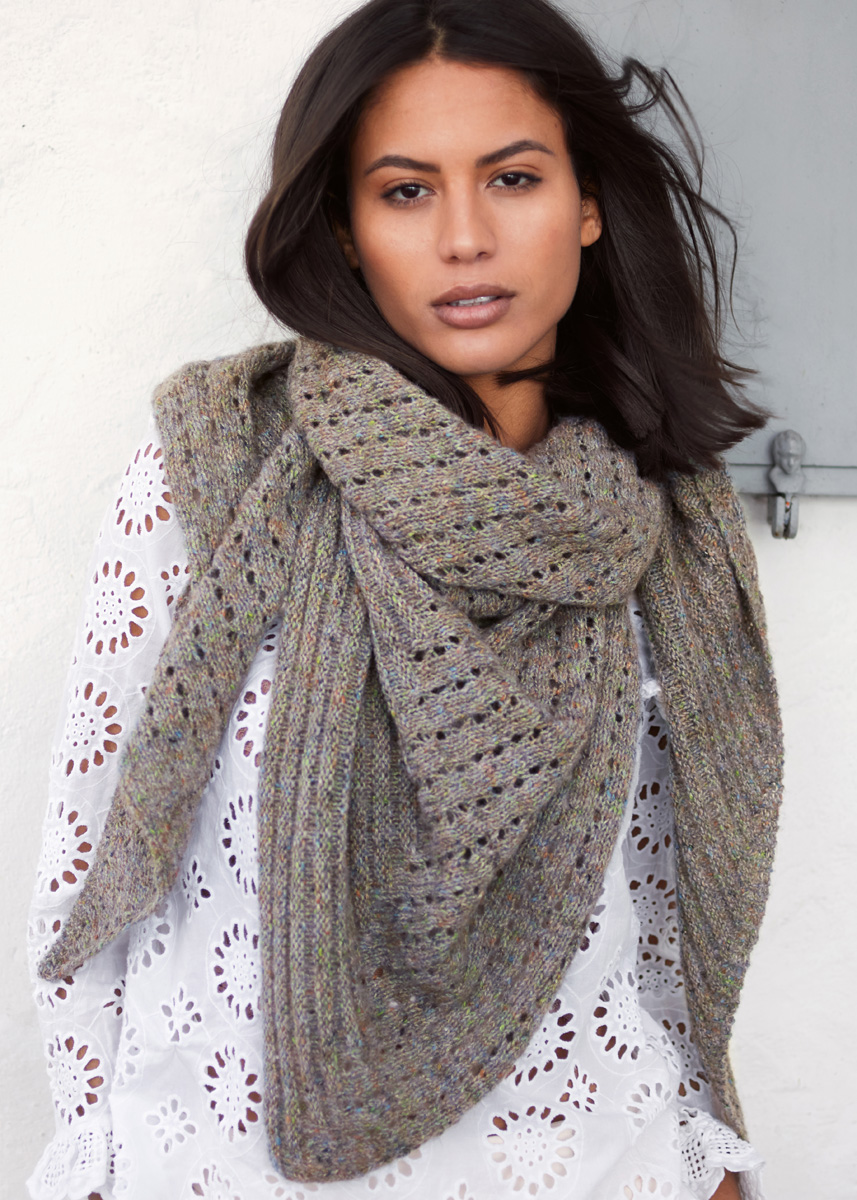 Lana Grossa Ecopuno Tweed (61% Baumwolle, 15% Polyester, 14% Alpaka (Baby), 10% Schurwolle (Merino), Lauflänge 160 m/50 g), 350 g Grüngrau meliert (Fb 303); 1 Rundstricknadel Nr. 4, 80 cm lang.